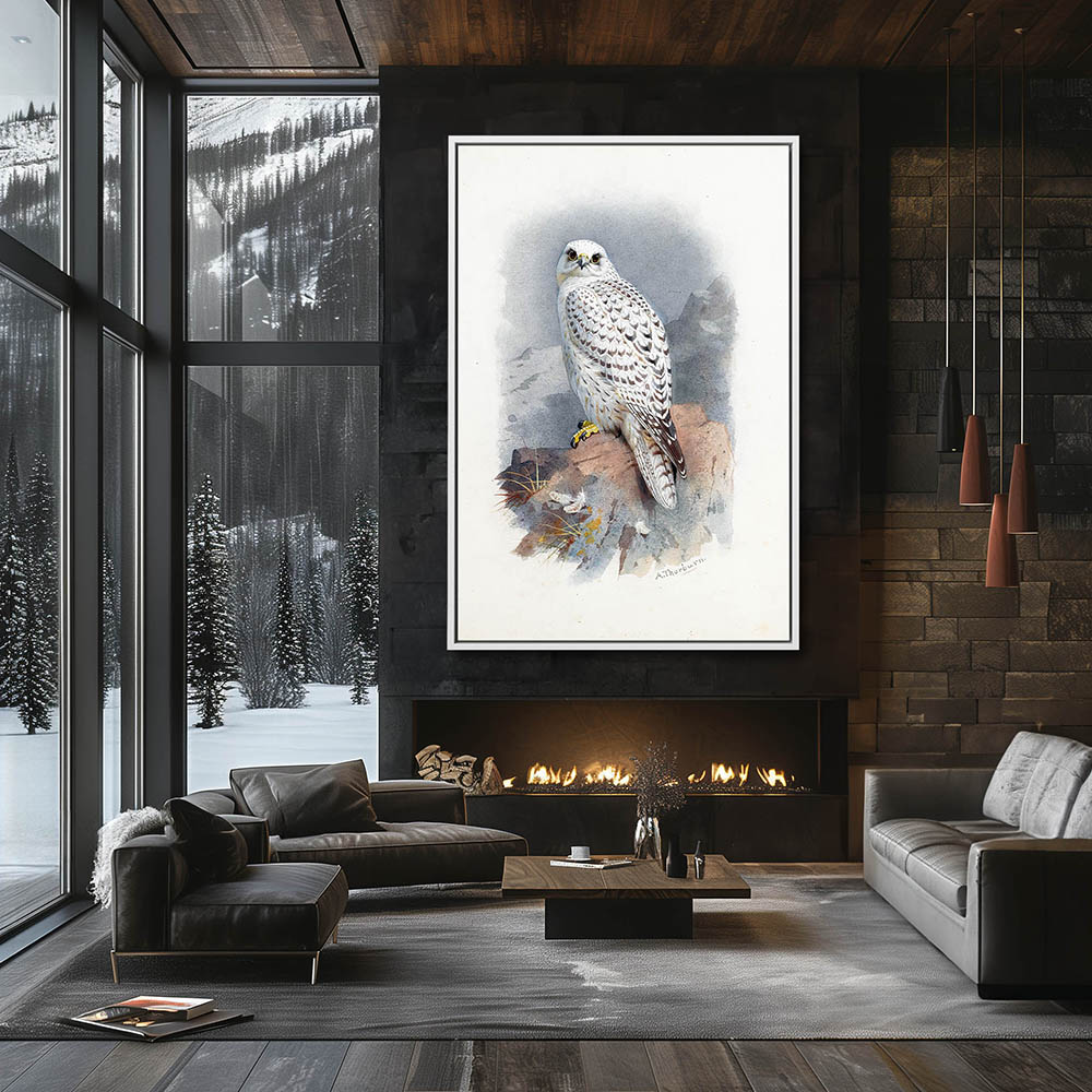 Painting of a White Greenland Falcon Sitting on a Rock in the Mountains