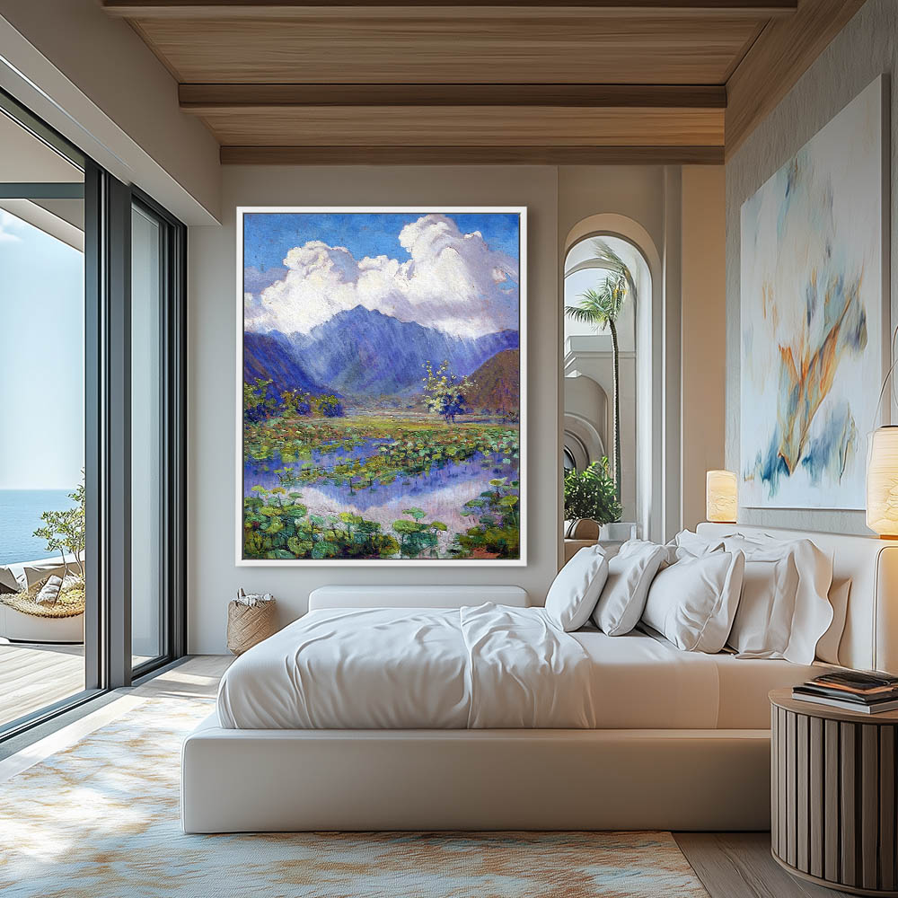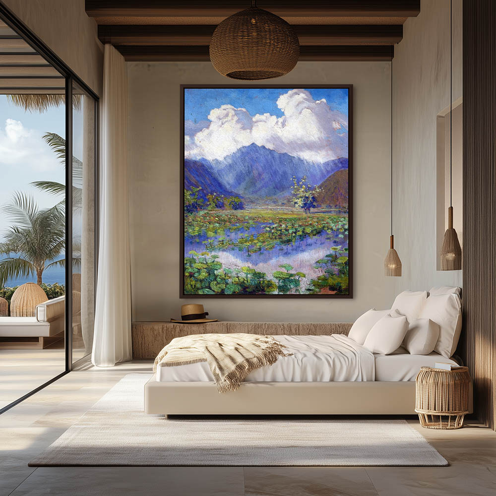 Landscape Painting with Lilly Pads Distant Mountains and Clouds