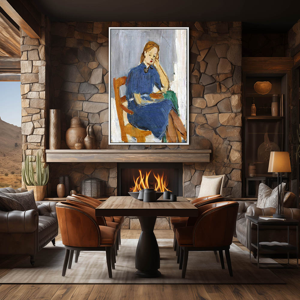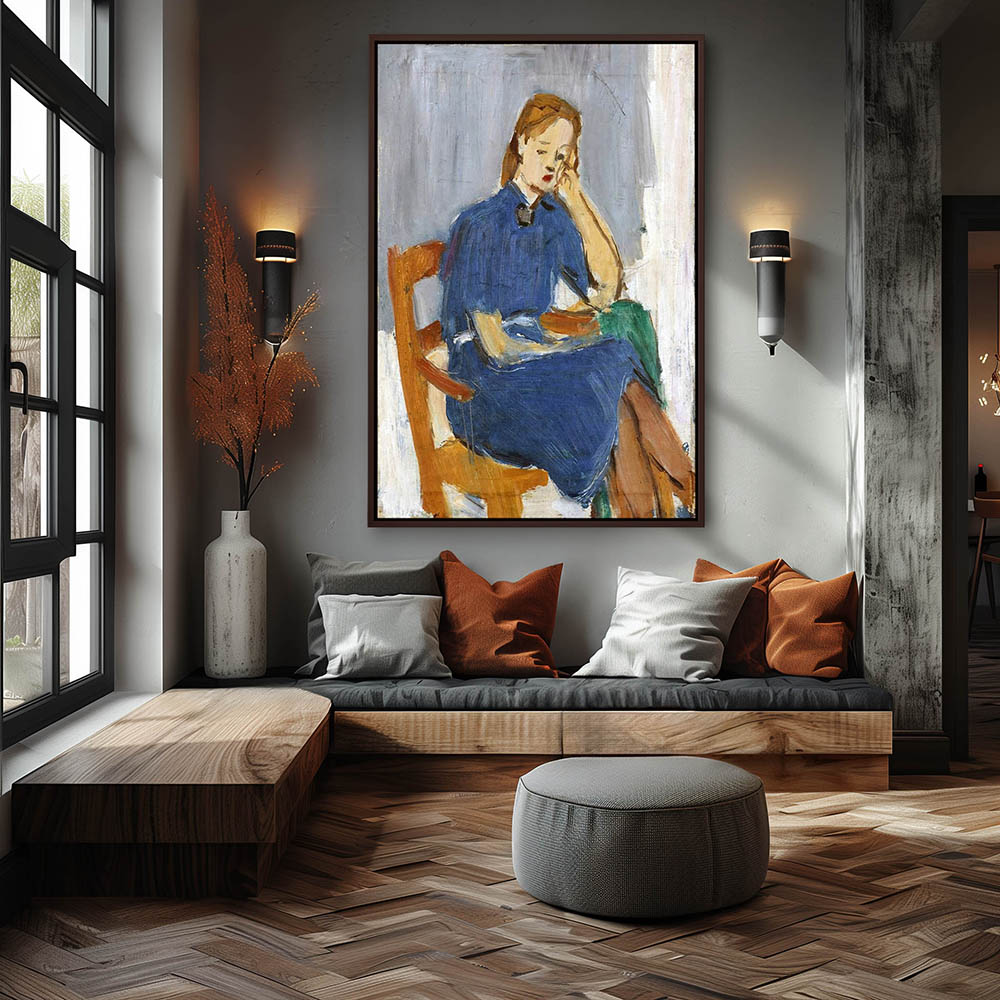 A sitting woman in a blue dress