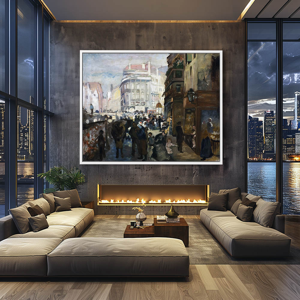 Vintage Landscape Painting with Figures and Buildings in Paris