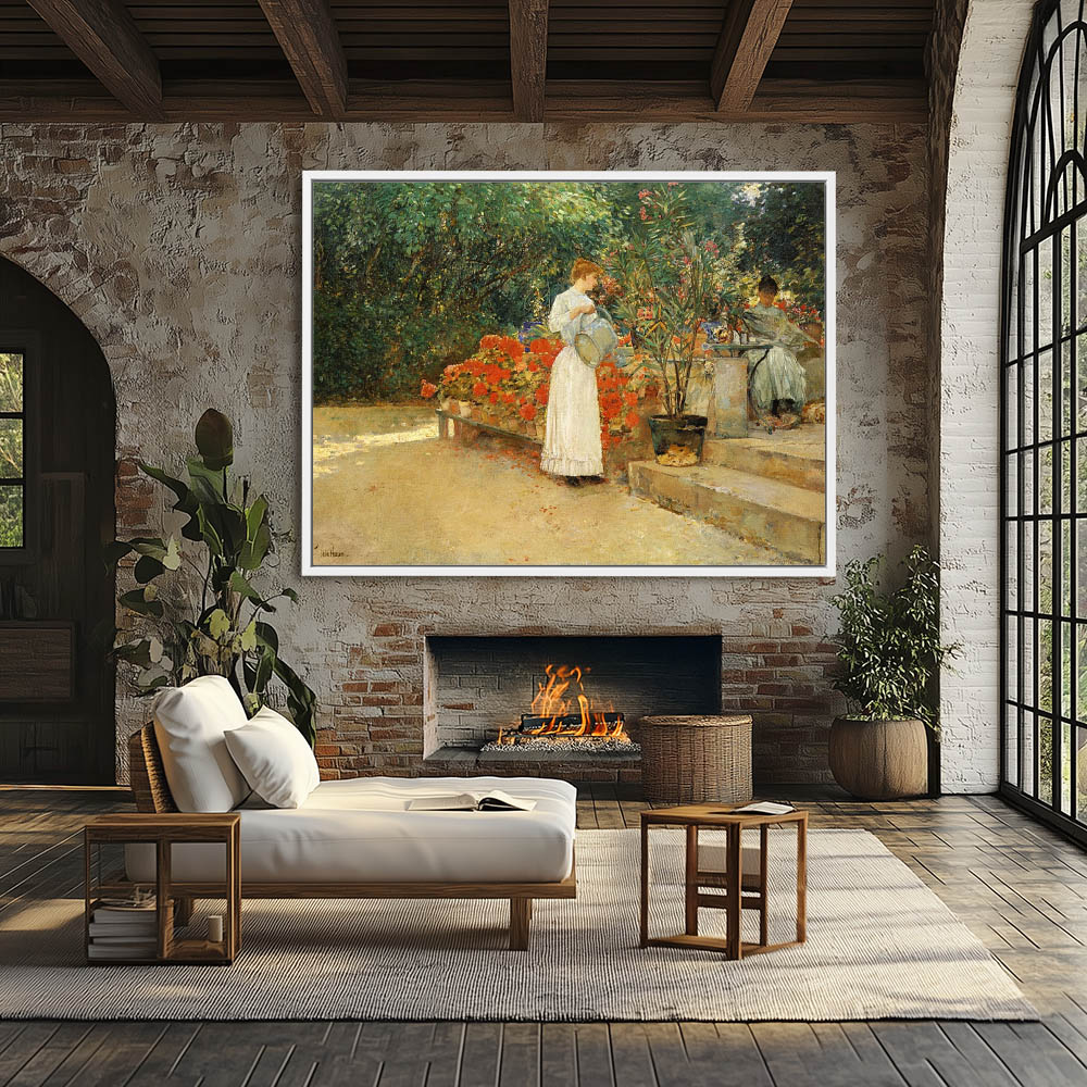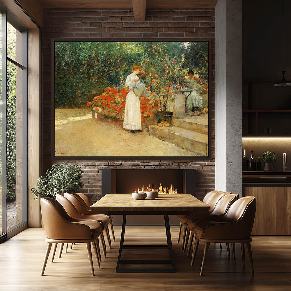 Women in a courtyard tending flowers and reading with morning sunlight streaming through