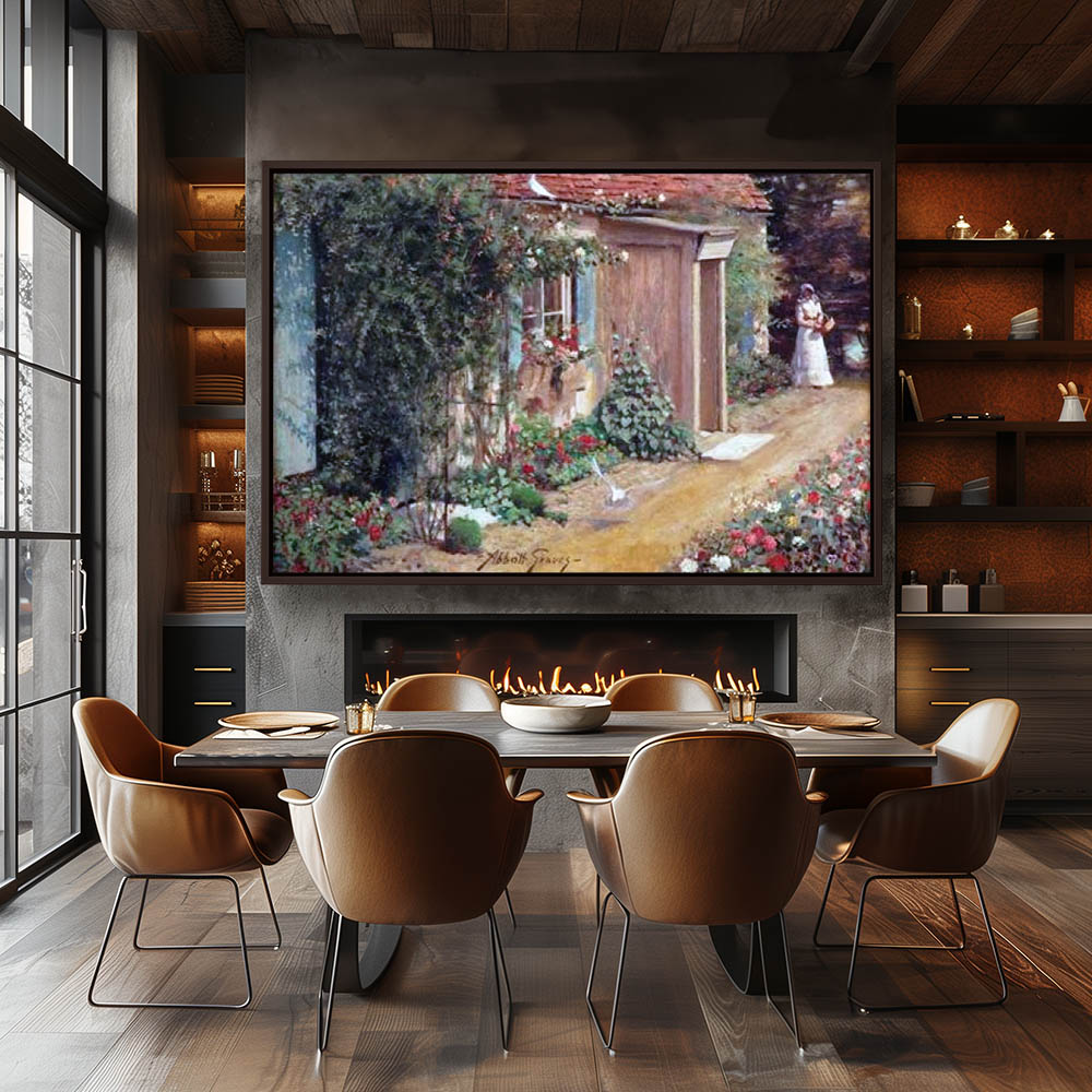 Vintage Landscape Painting with a Woman walking the Garden Path
