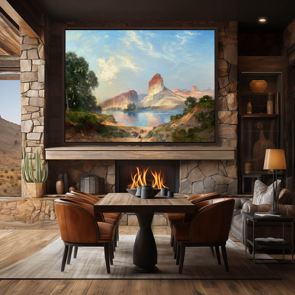 Vast landscape with mountains in the distance, a large lake and Indians on horseback traveling to the water through a valley in the foreground