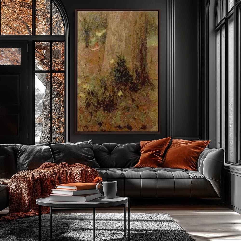 Abstract landscape of the base of a large tree with shrubs and flowers