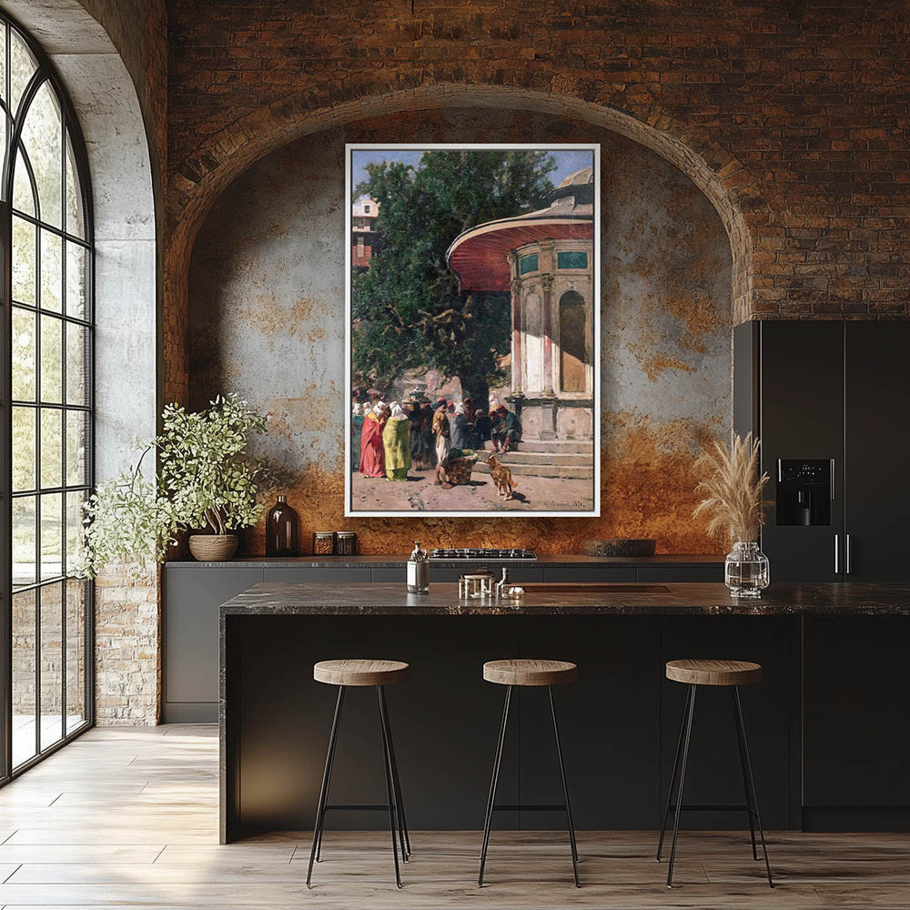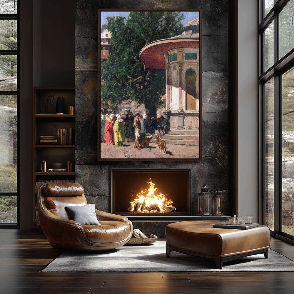Landscape Painting with Figures Gathered Around the Fountain in the City