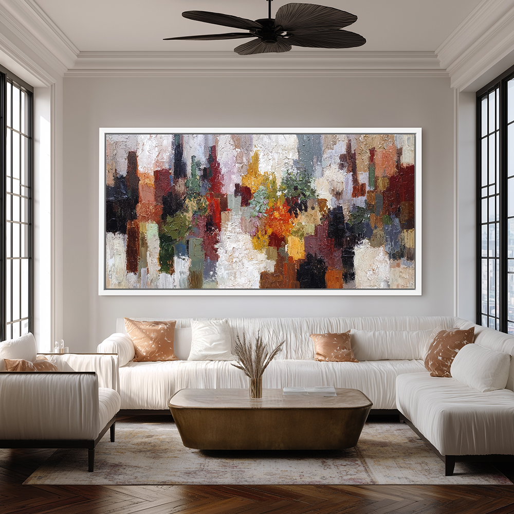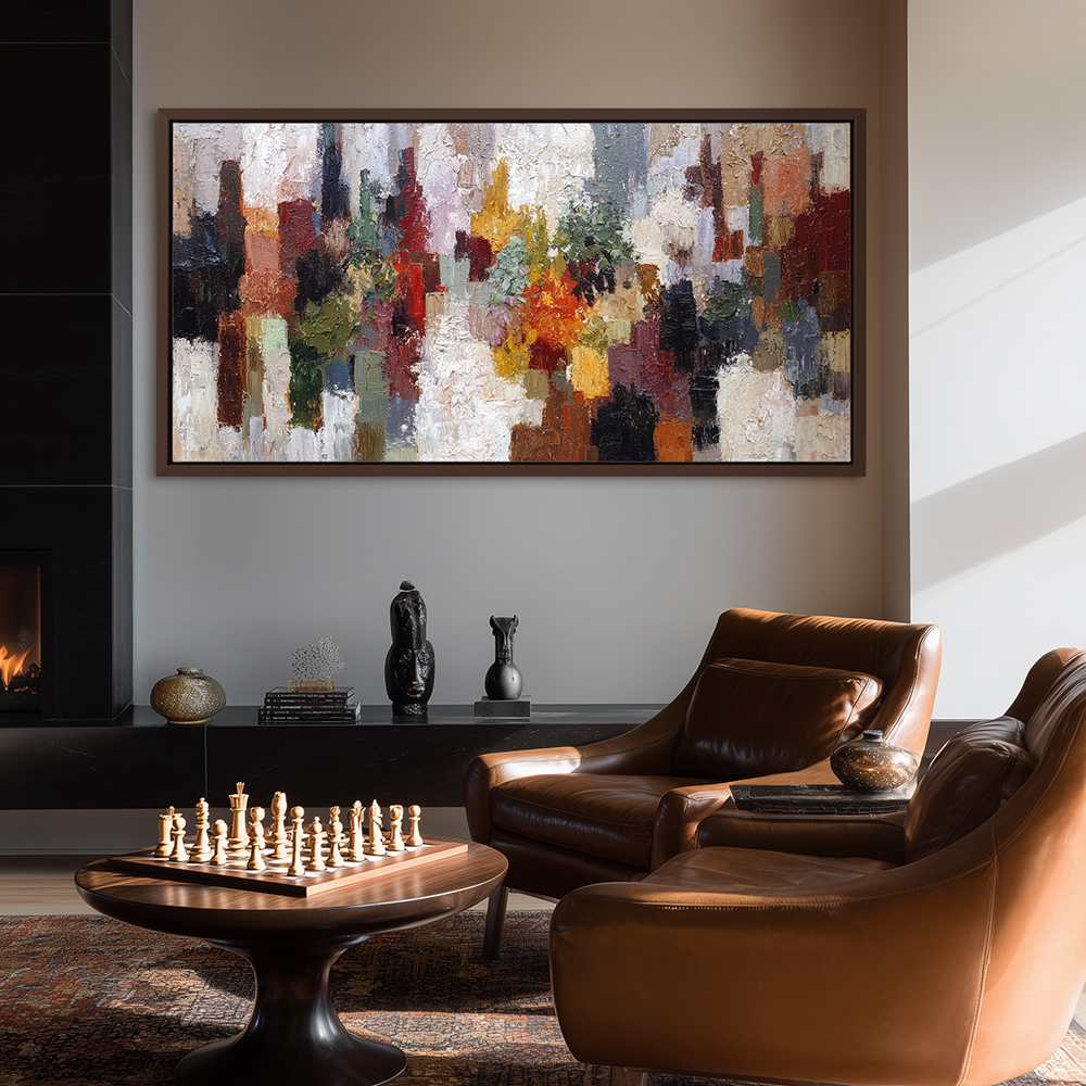 Abstract art of a cityscape in autumn, showcasing stunning fall colors, makes a perfect addition to your wall decor collection. This canvas painting is available in a variety of sizes and formats, such as metal wall art, metal prints, vinyl wall art, vinyl prints, peel-and-stick vinyl, vinyl wall peels, framed wall art, framed prints, fine art prints, poster art, poster wall art, poster prints, stretched canvas, stretched canvas wall art, and framed canvas wall art with floater frames. Frame colors include black, white, and brown, providing choices to suit any style.