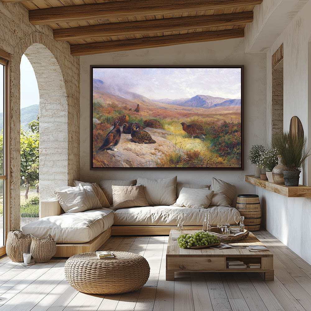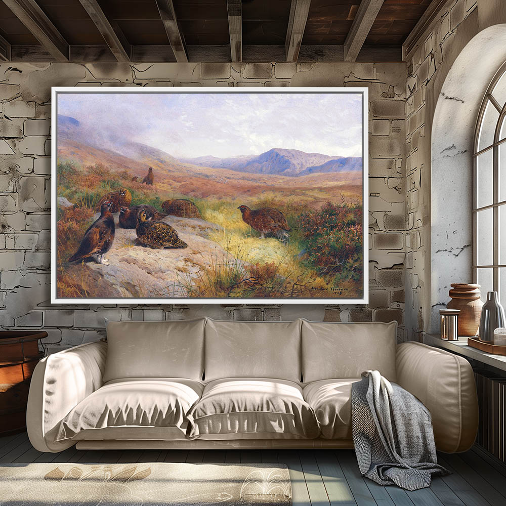 Autumn Sunshine Covey of Red Grouse with Rising Mist Beyond