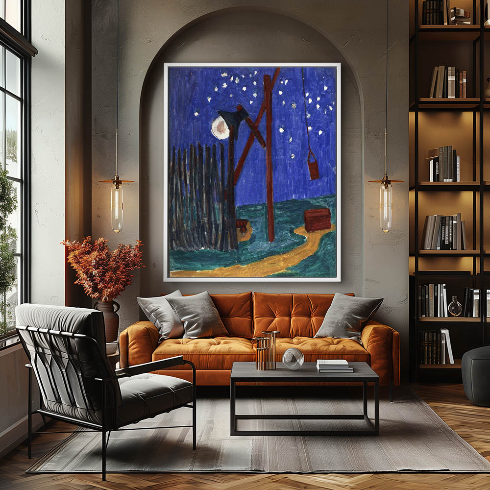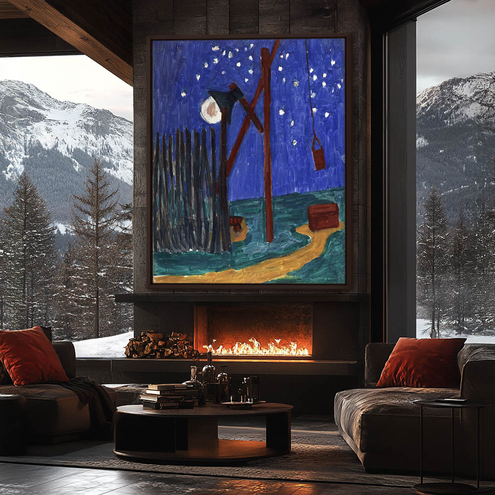 Vintage Abstract Landscape Painting of Nighttime with an Ax in the Moon