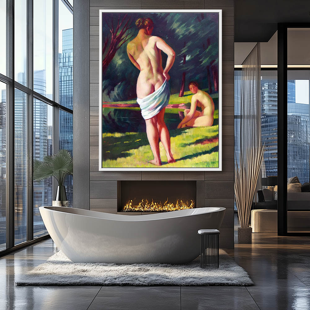Figurative Painting of Two Nude Women Bathing in the Pond