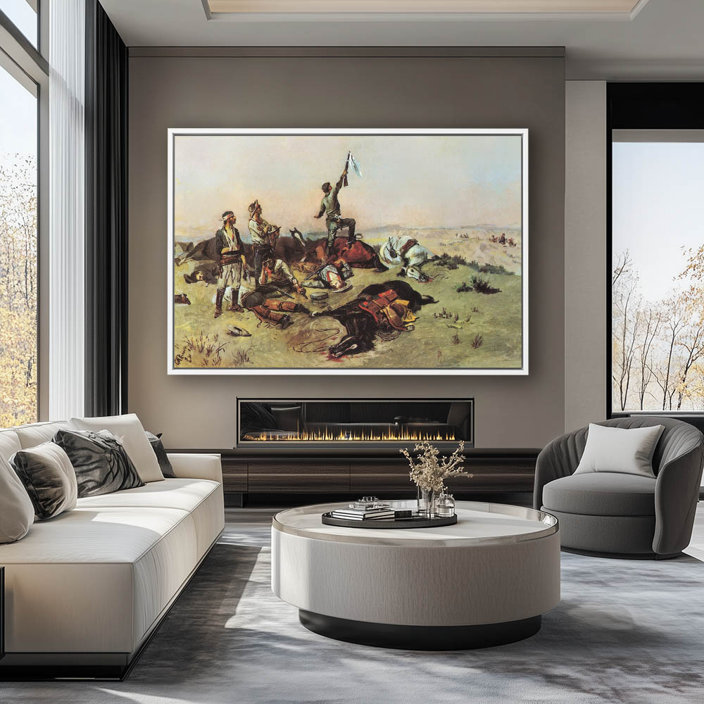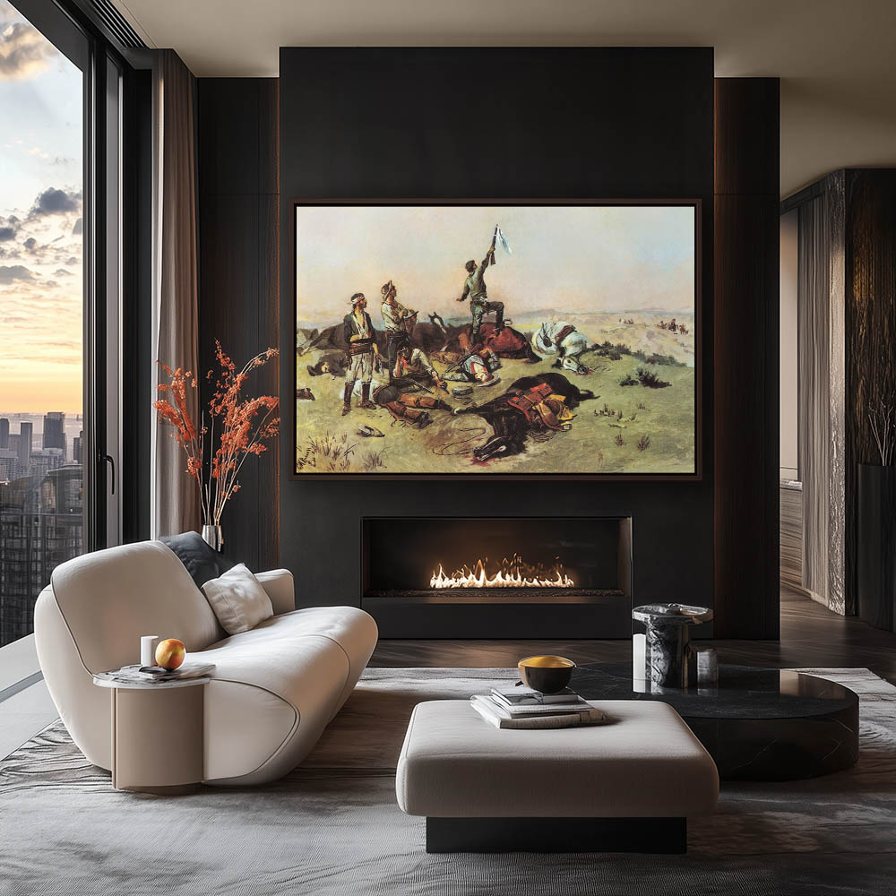Cowboys calling a truce with a white flag after a gunfight that cost men and horses