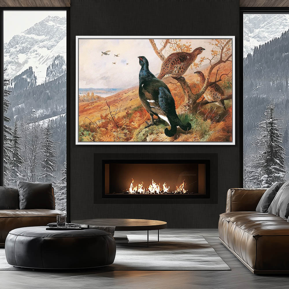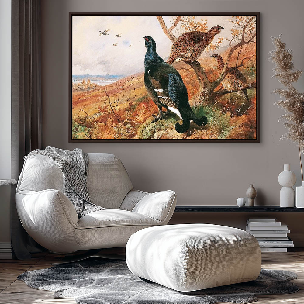 Painting of Blackgame Gamebirds in an Open Landscape Resting in a Small Tree