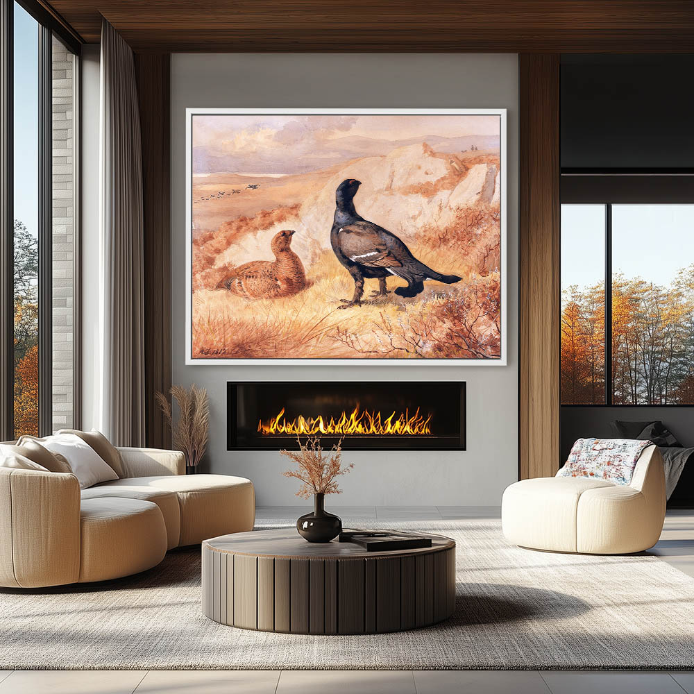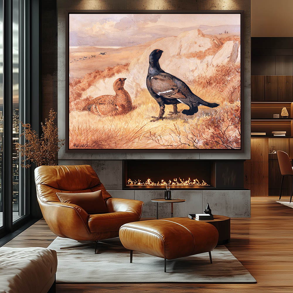 Open Landscape Painting with Gamebirds Resting and Hunters Approaching