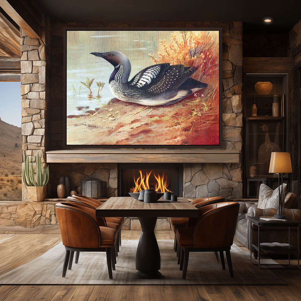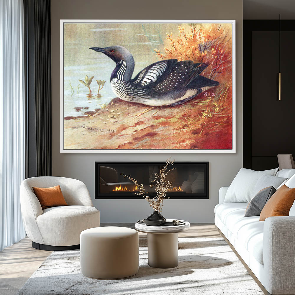 Painting of a Black Throated Diver Water Bird Resting on Shore