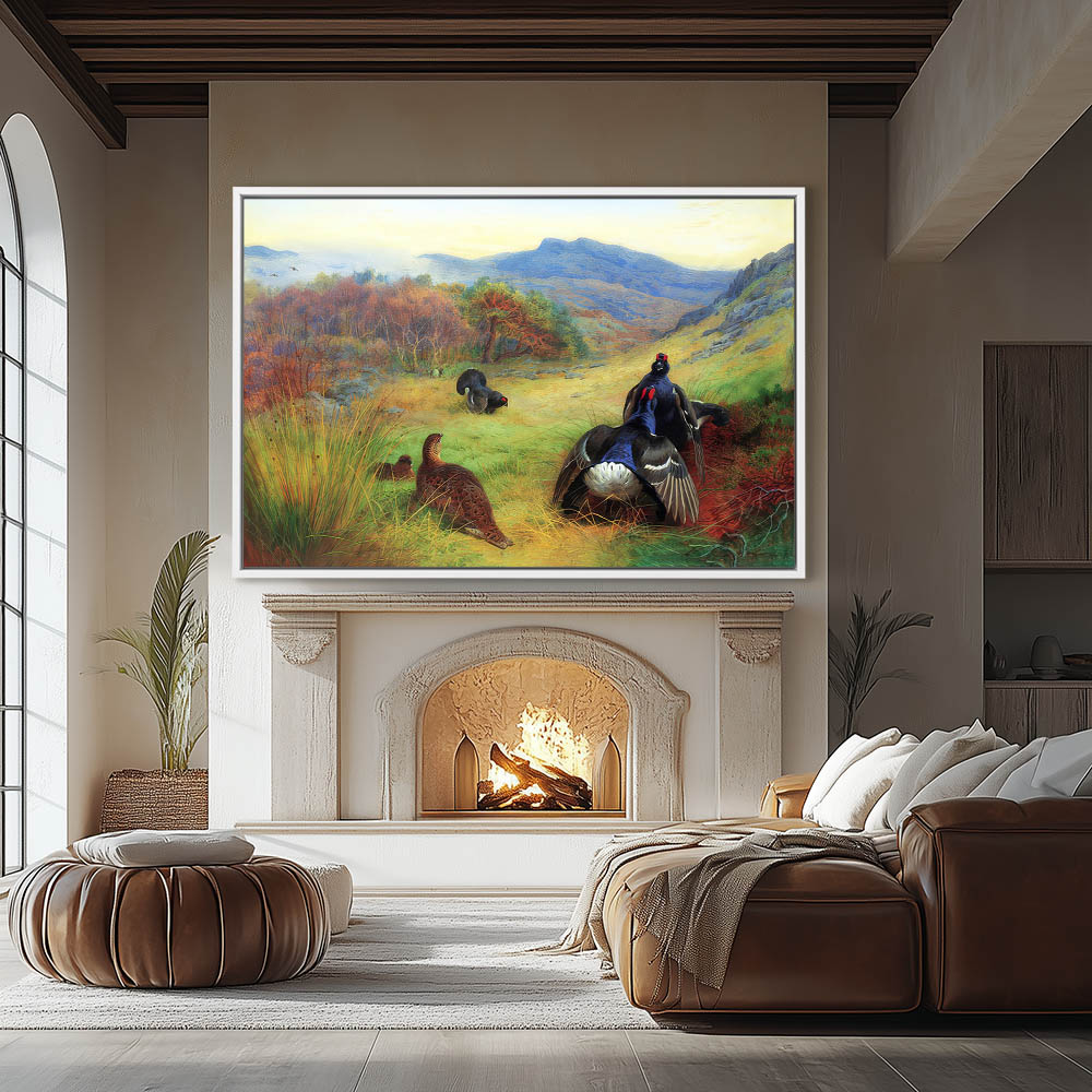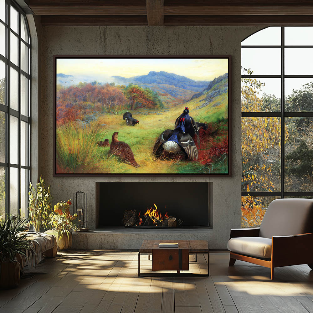 Landscape Painting with Blackcock Gamebirds Fighting with the Females Watching