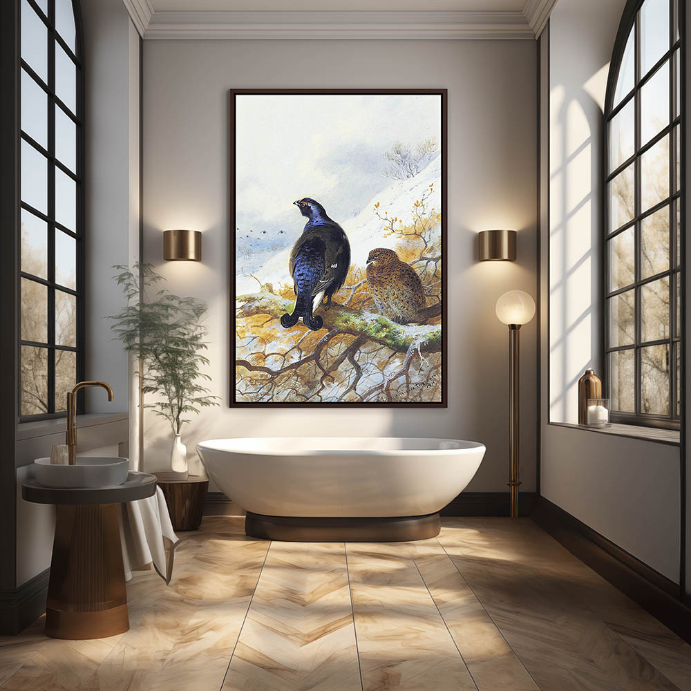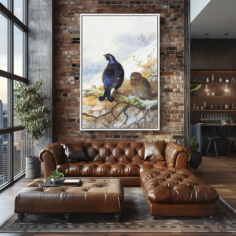Painting of Blackgame Gamebirds Perched on a Tree Limb in a Winter Landscape