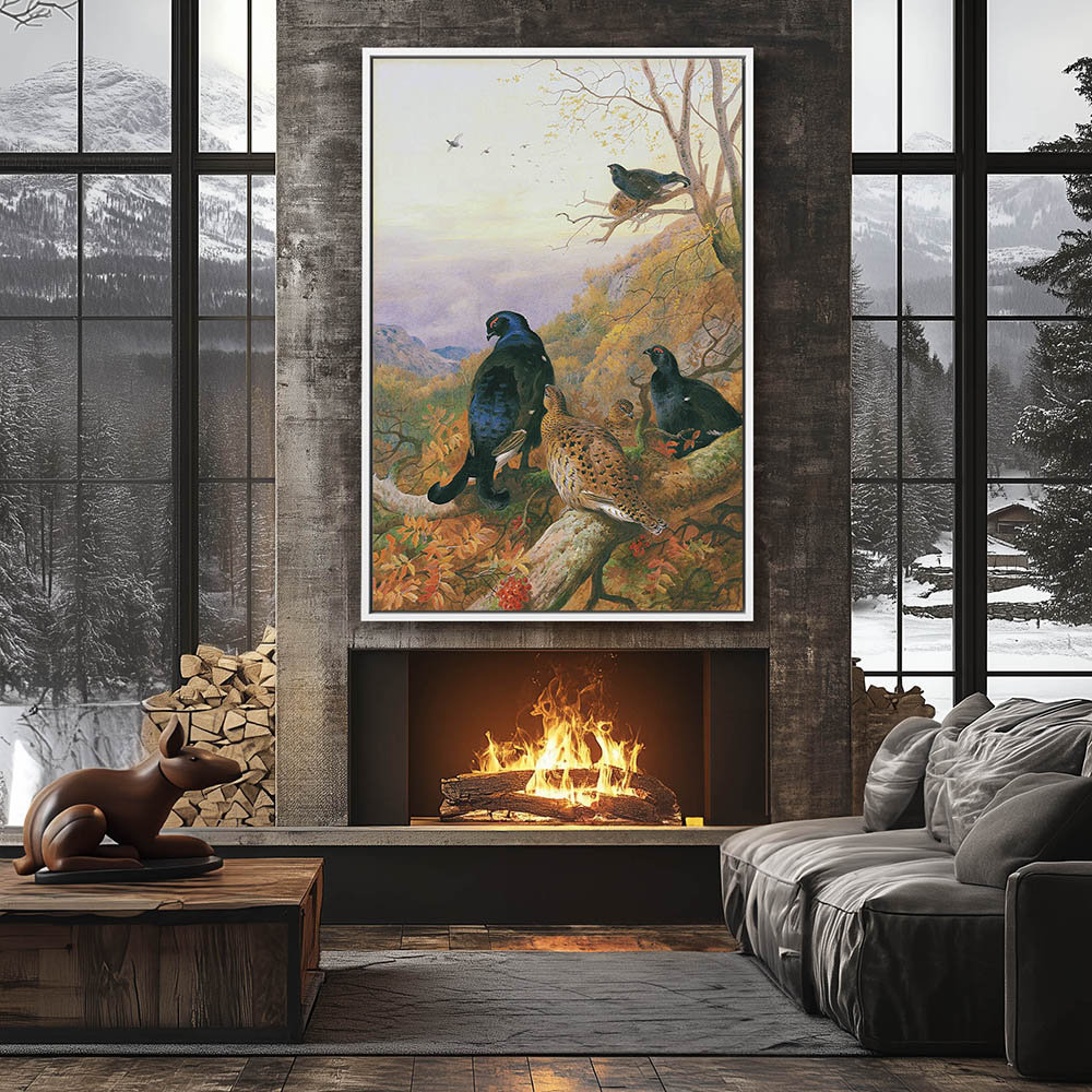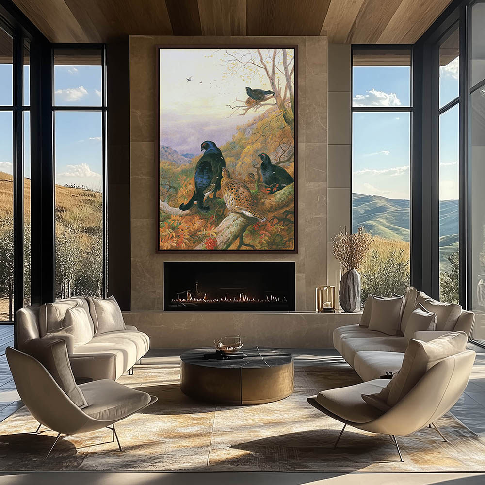 Mountain Landscape Painting with a Covey of Blackgame Resting in the Limbs