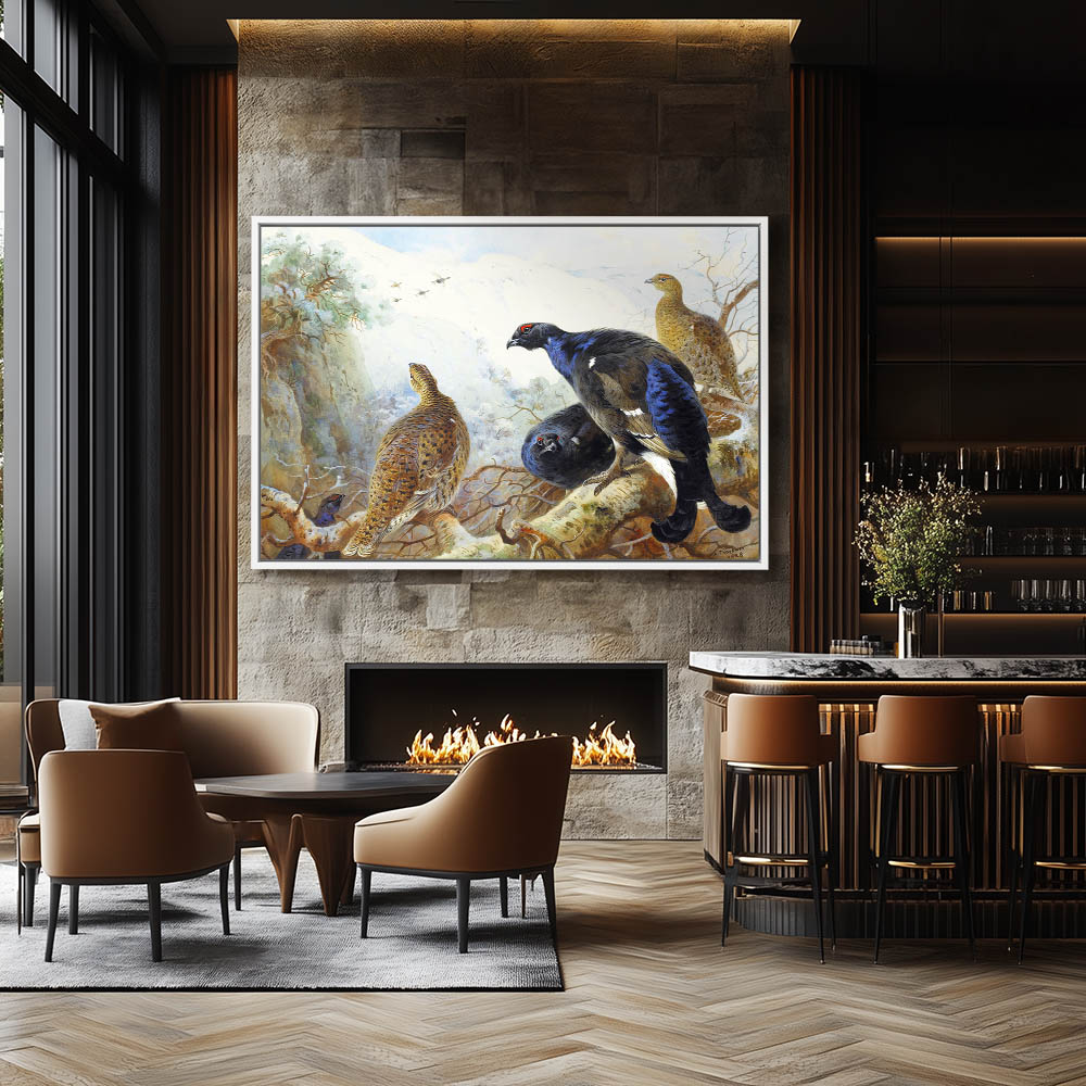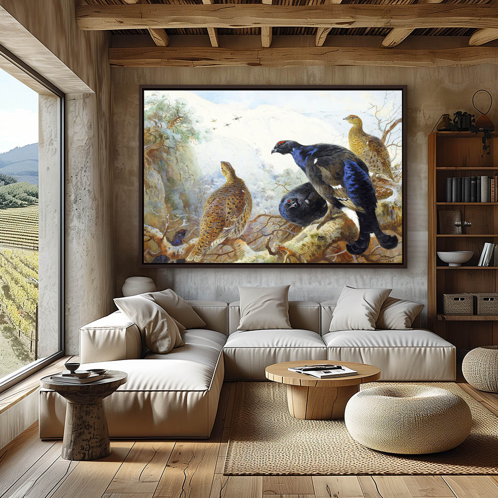 Mountain Forest Landscape Painting with Blackgame Resting on a Limb