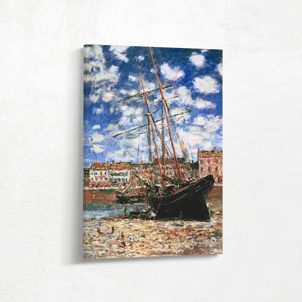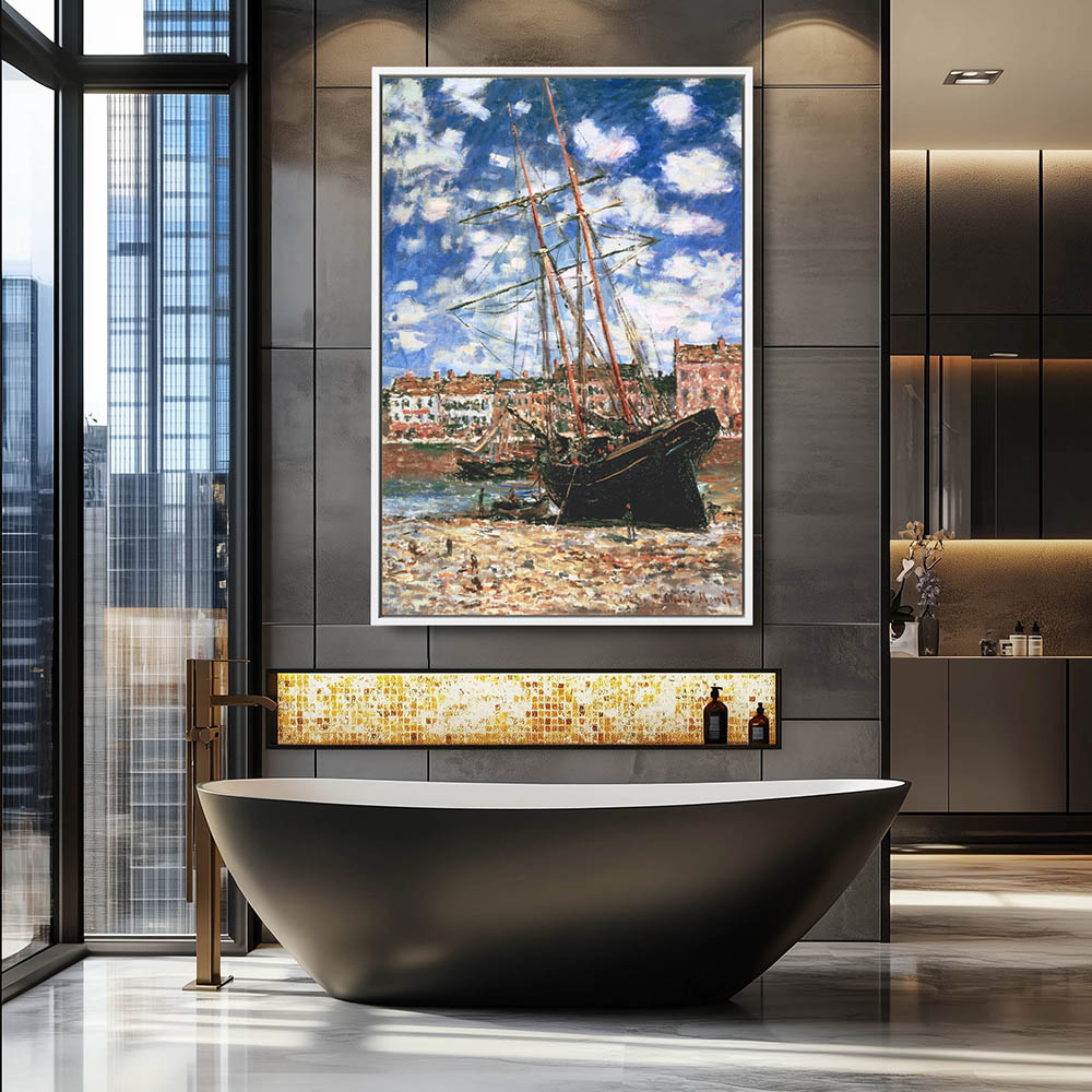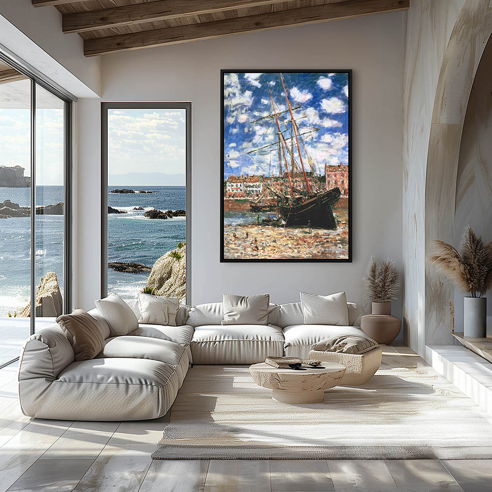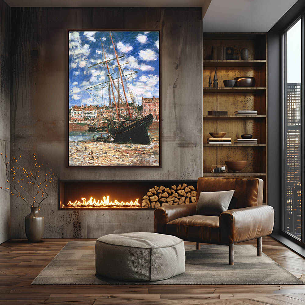 Vintage Seascape Painting with a Boat on Shore at Low Tide