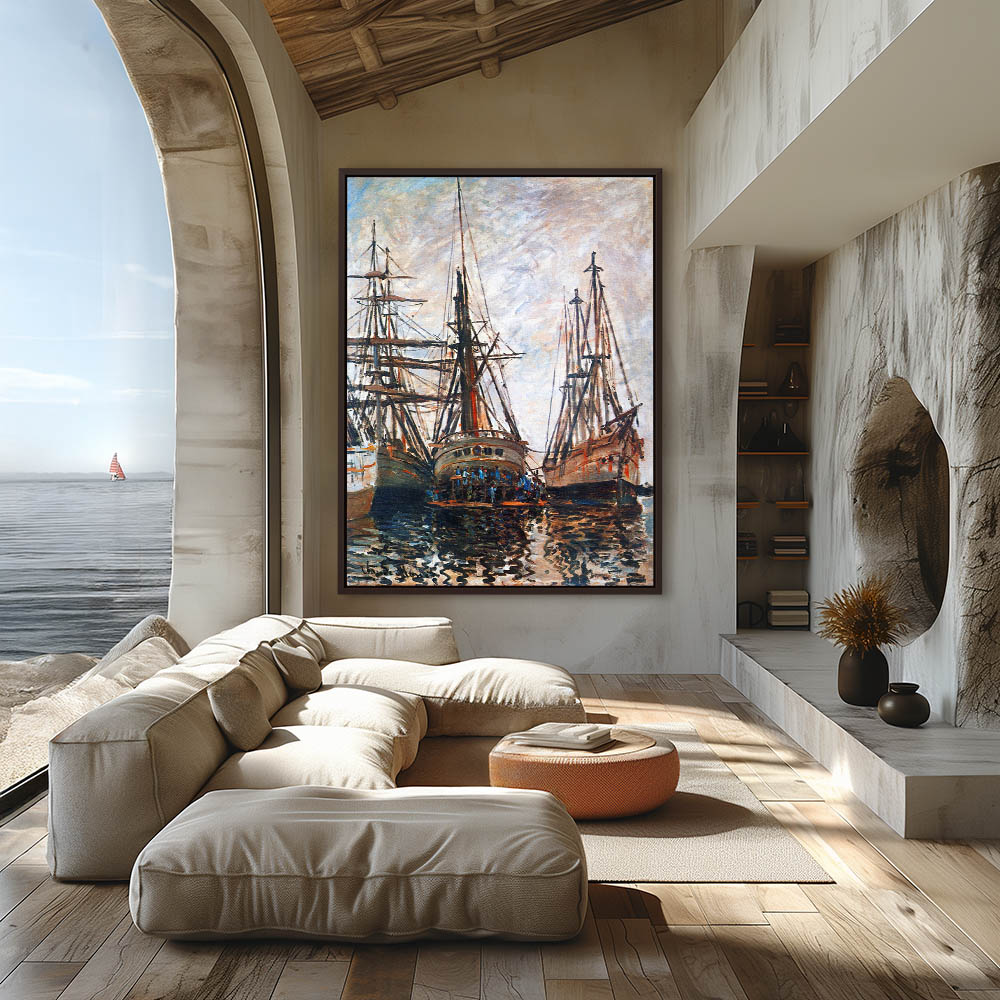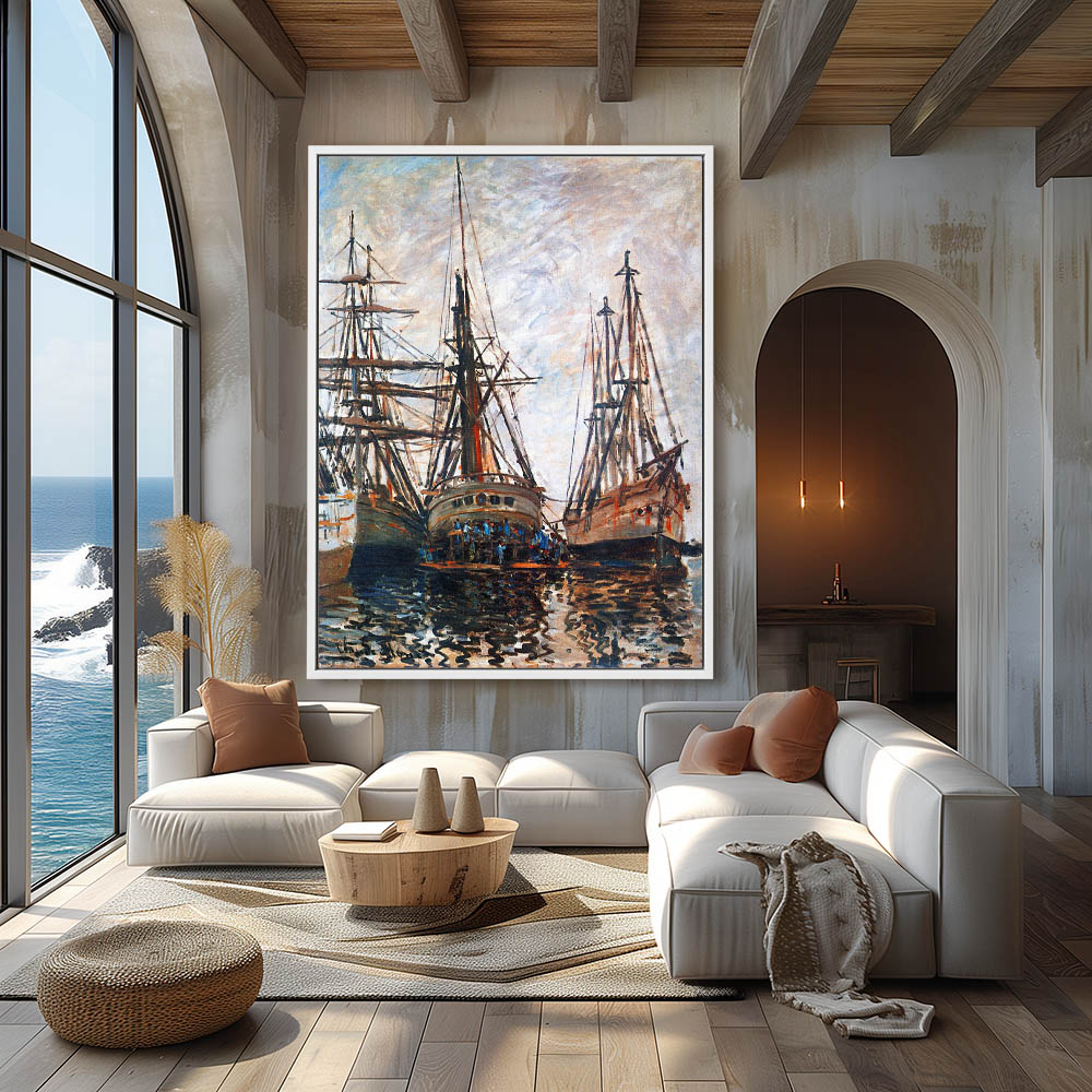 Vintage Seascape Painting of Boats being Repaired in the Harbor