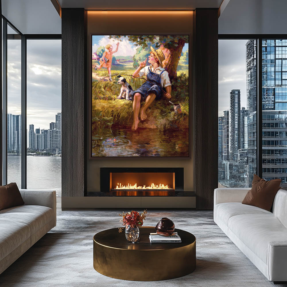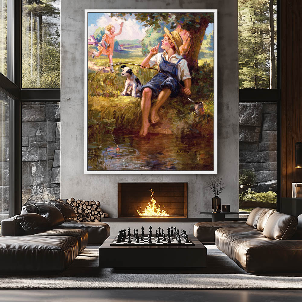 Landscape Painting with a Boy Fishing with his puppy and a Girl Running up