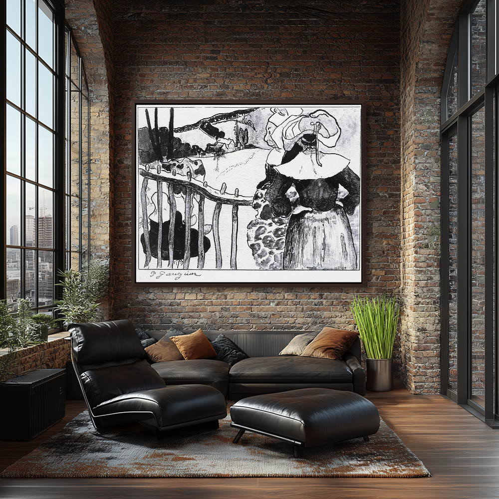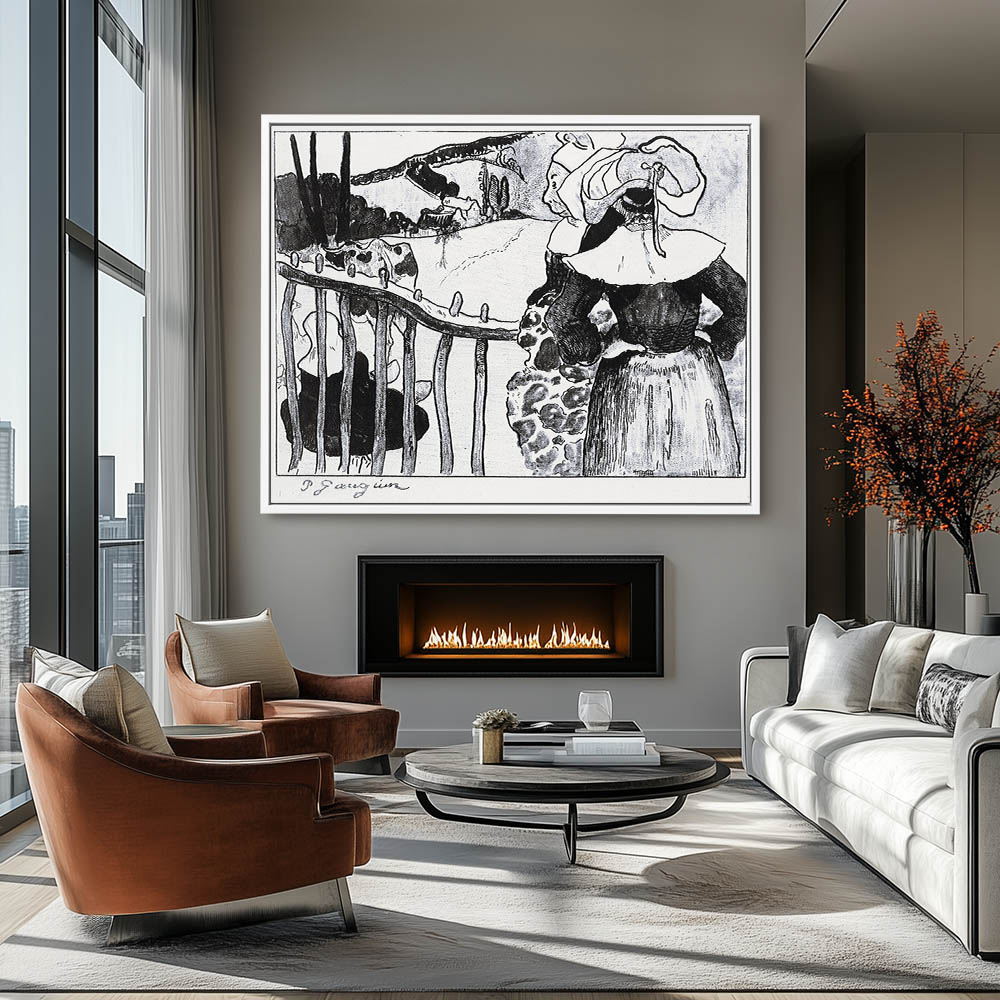 Vintage Figurative Drawing of a Woman Standing beside a Fence