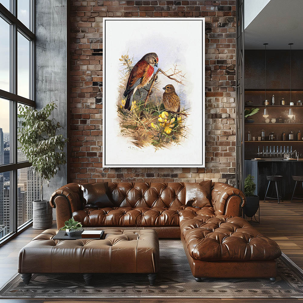 Painting of Brown Linnet Birds on a Limb with Flowers
