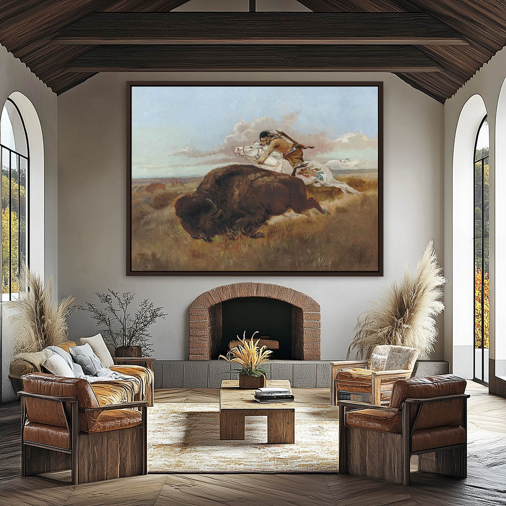 Indian hunter on horseback running down a buffalo to shoot it with an bow and arrow