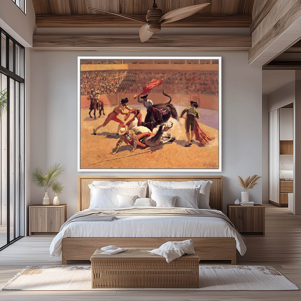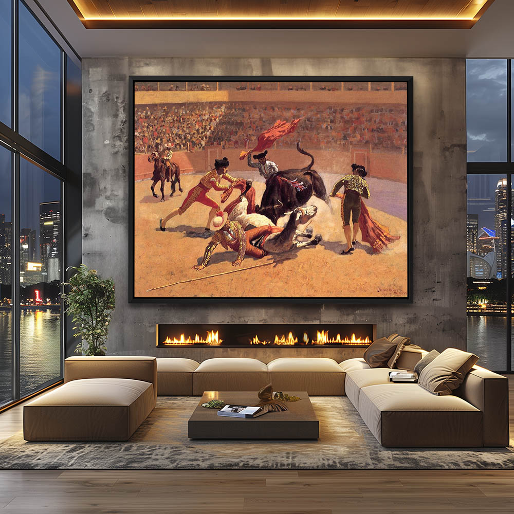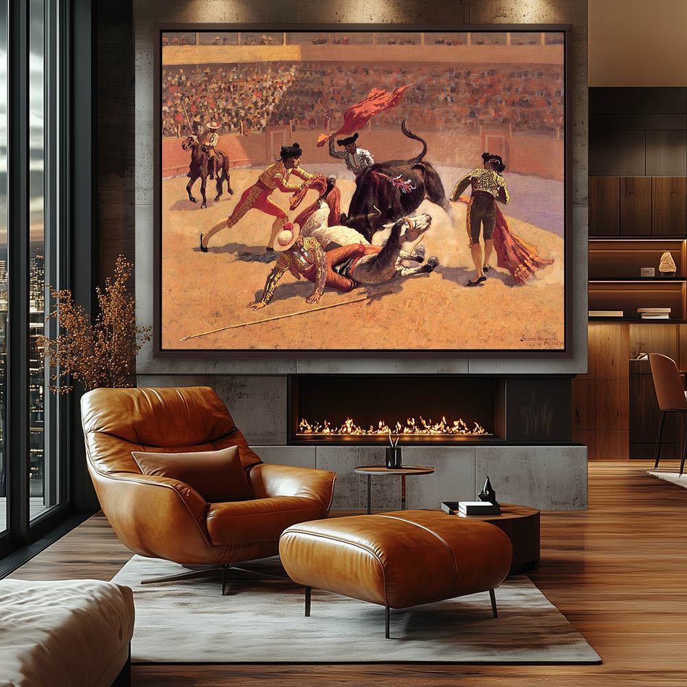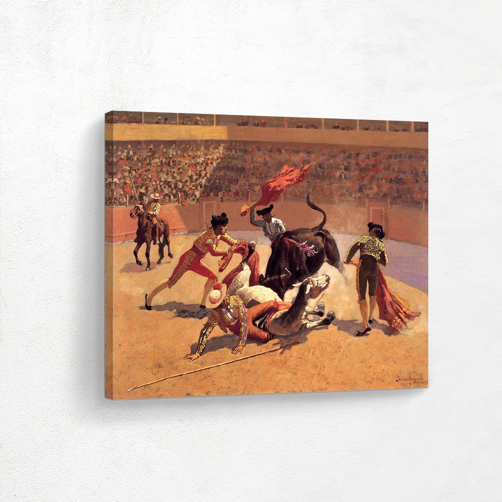 Bull after a fallen horse and rider while three figures, two Picadores and a Matador, work to get his attention.