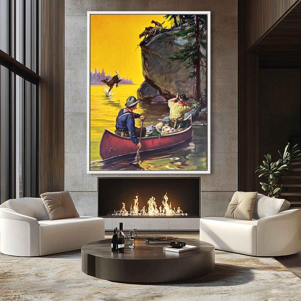 Hunters in a canoe, shooting wolves who run a deer off a ledge into the water
