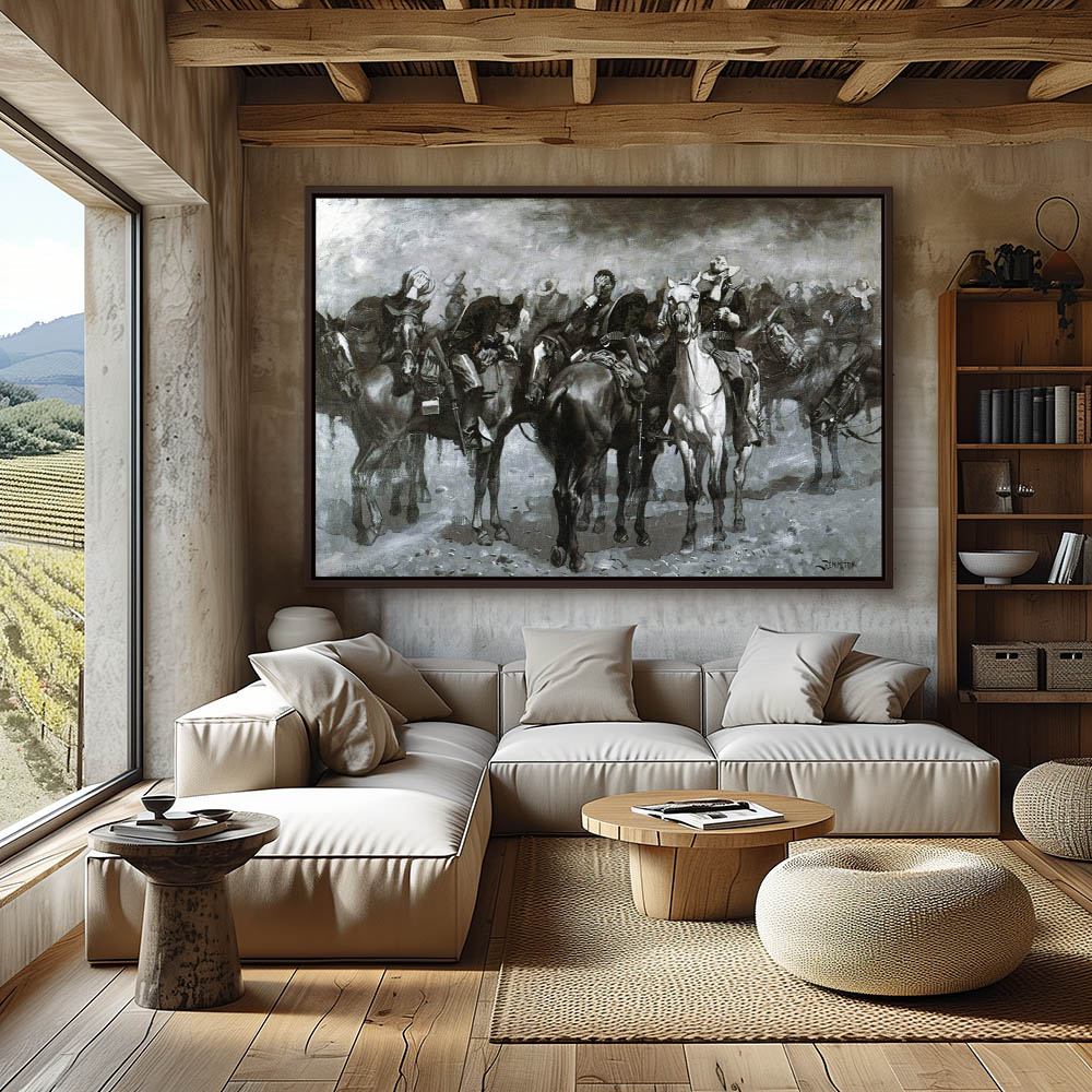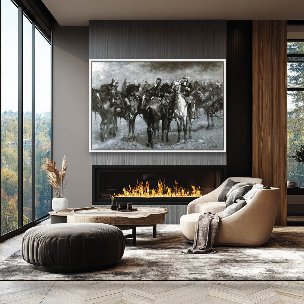 Soldiers on horseback shielding their faces from the sandstorm overtaking them