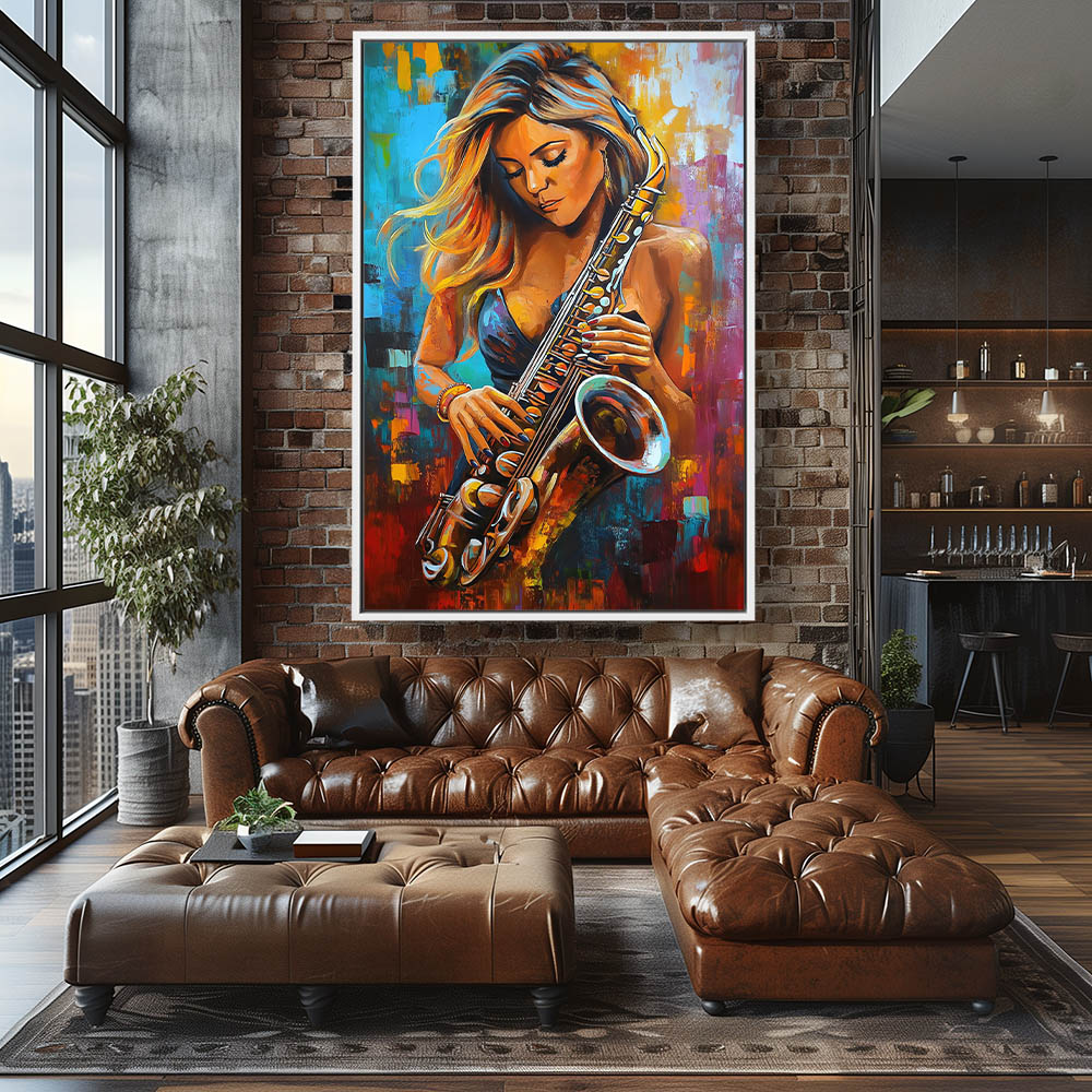 Abstract Painting of a Beautiful Woman Playing a Saxophone