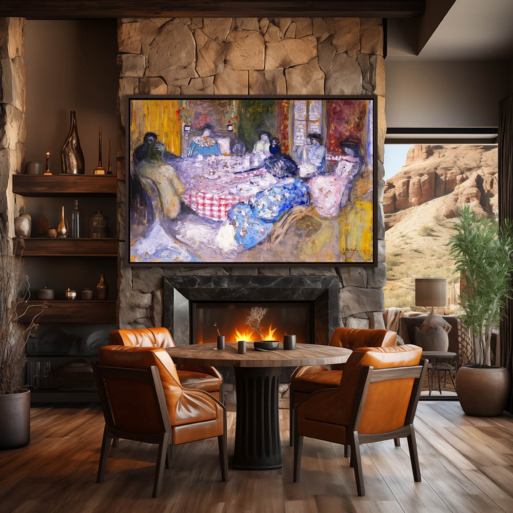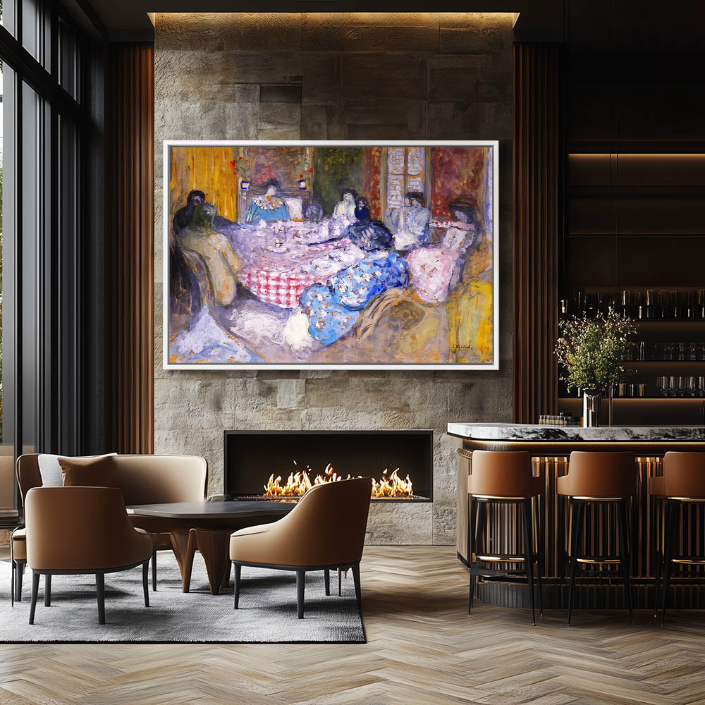 Abstract figures gathered around a table with a checkered tablecloth