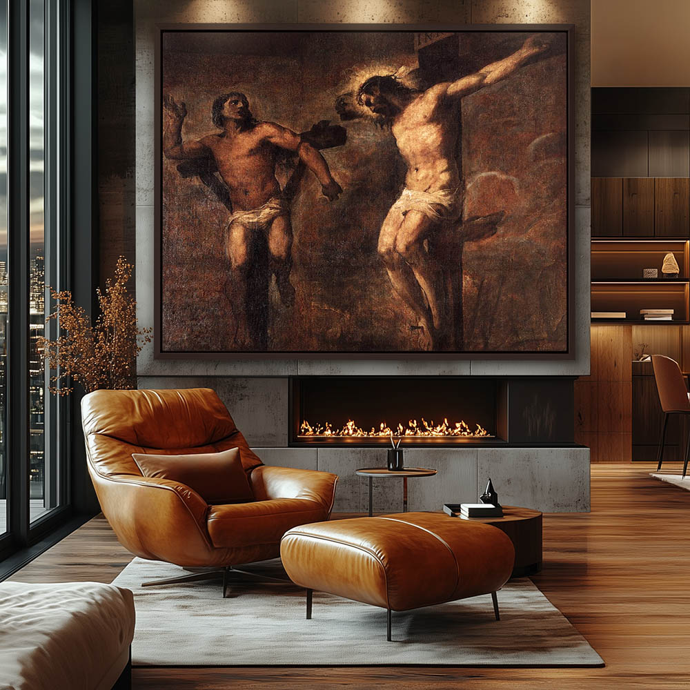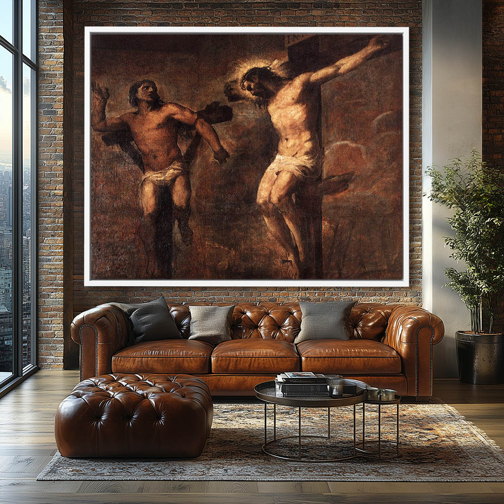 Vintage Figurative Portrait Painting of Jesus Christ on The Cross and the Good Theif