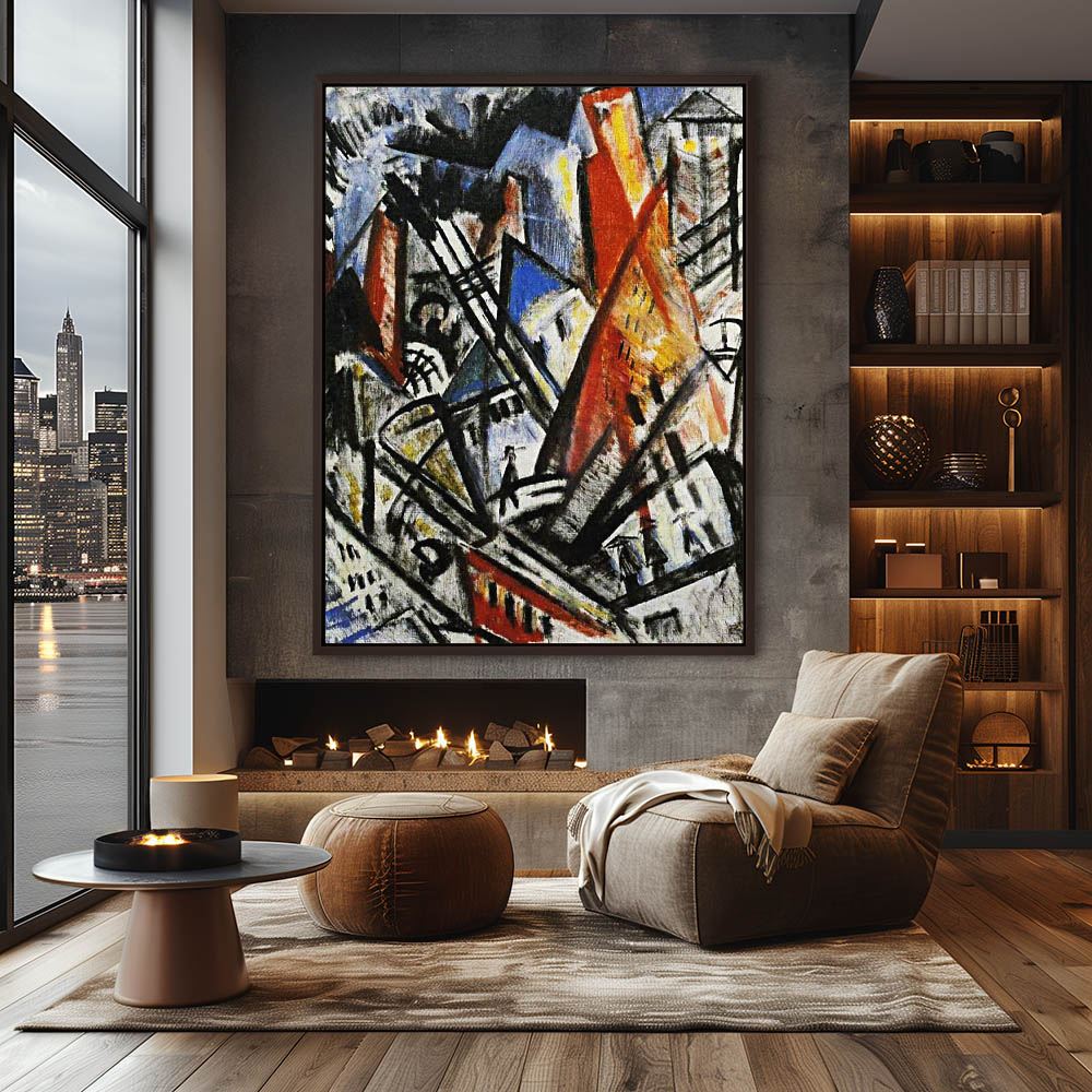 Vintage Abstract Cubo Futurtism Painting of a City Skyline