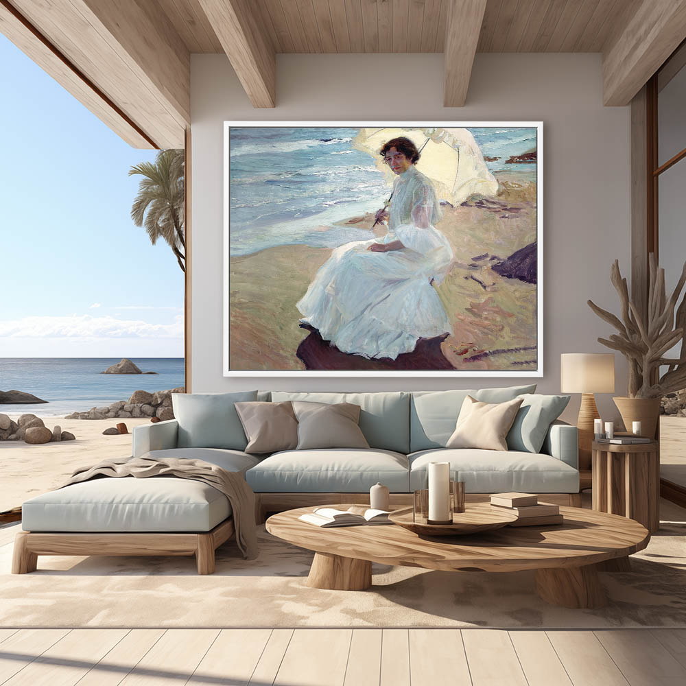 Woman in white with a parasol on the beach