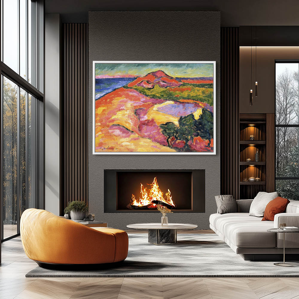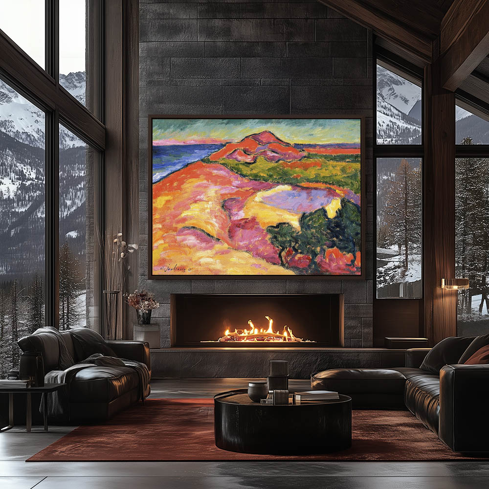 Abstract Landscape Paintingwith a Red Hill on the Coast