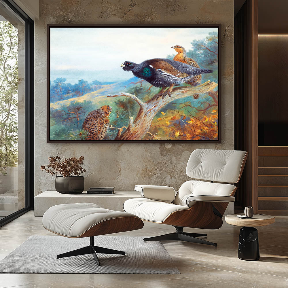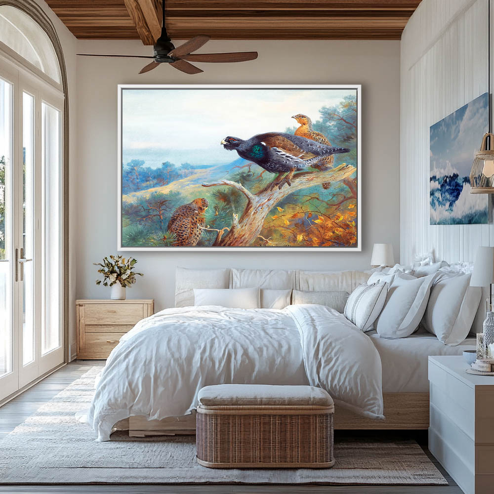 Forest Landscape Painting with Grouse Resting on a Limb