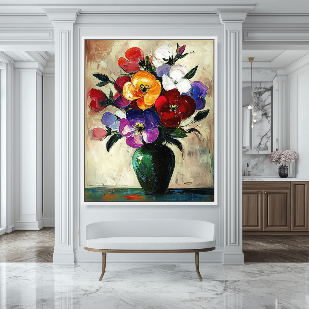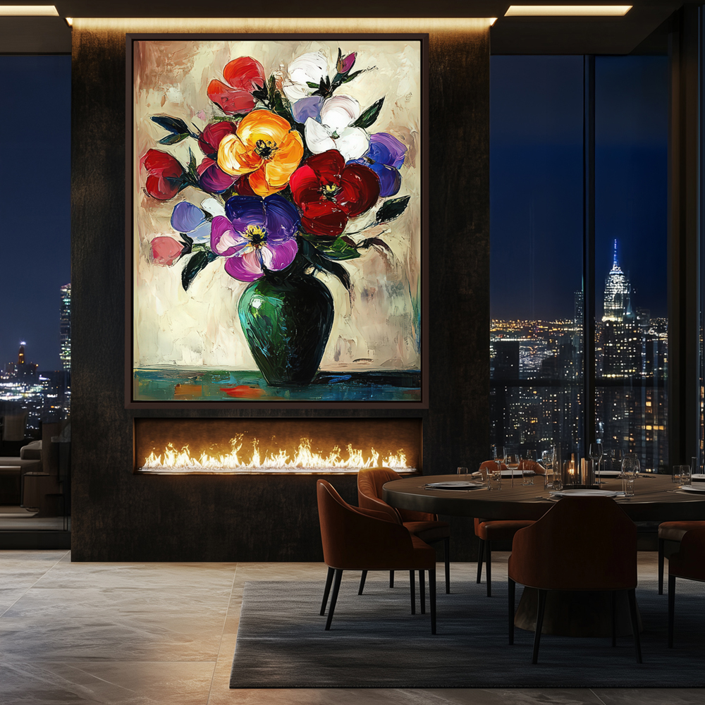 Contemporary Still Life Painting of Very Colorful Flowers in a Green Vase