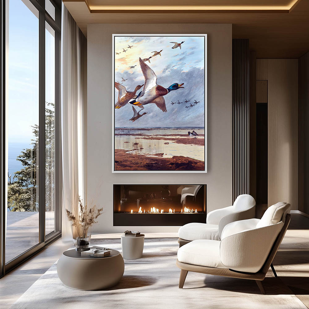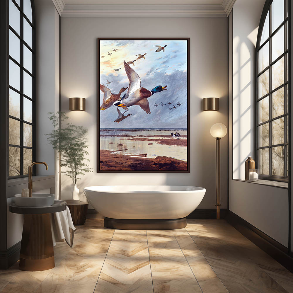 Coastal Painting of Mallards in Flight over the Shallows