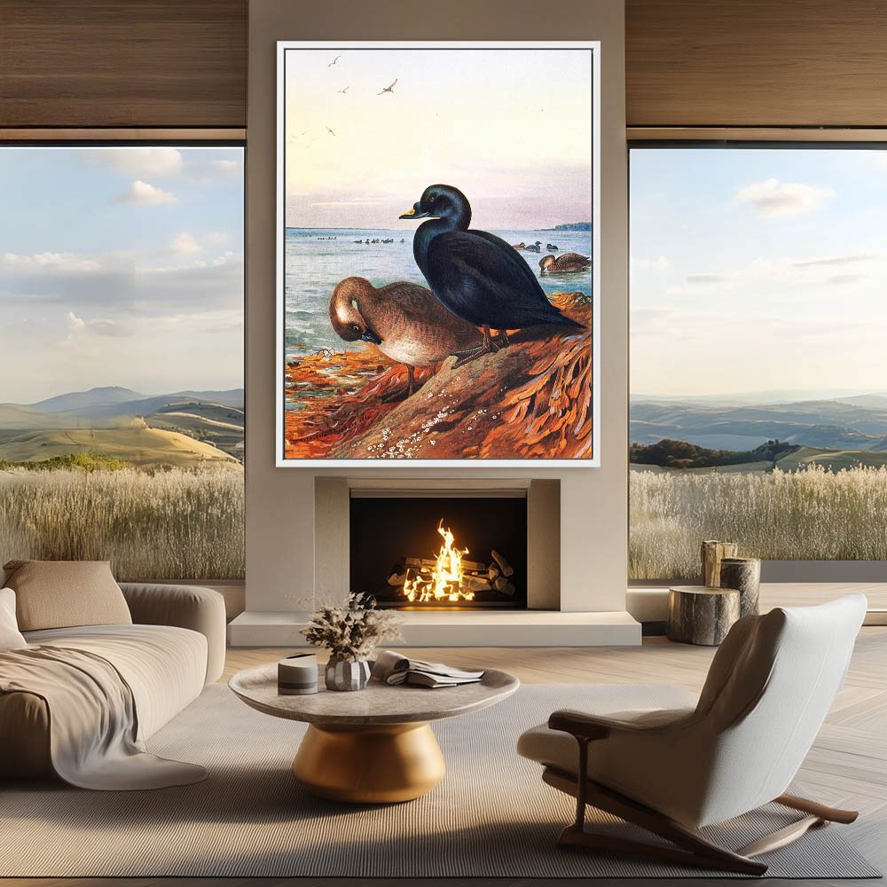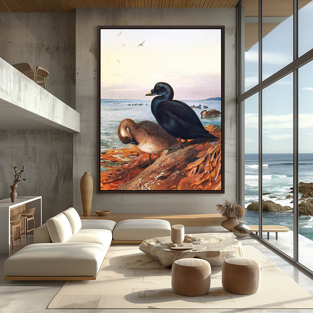 Coastal Landscape Painting with Ducks on a Rock and Swimming at Sea