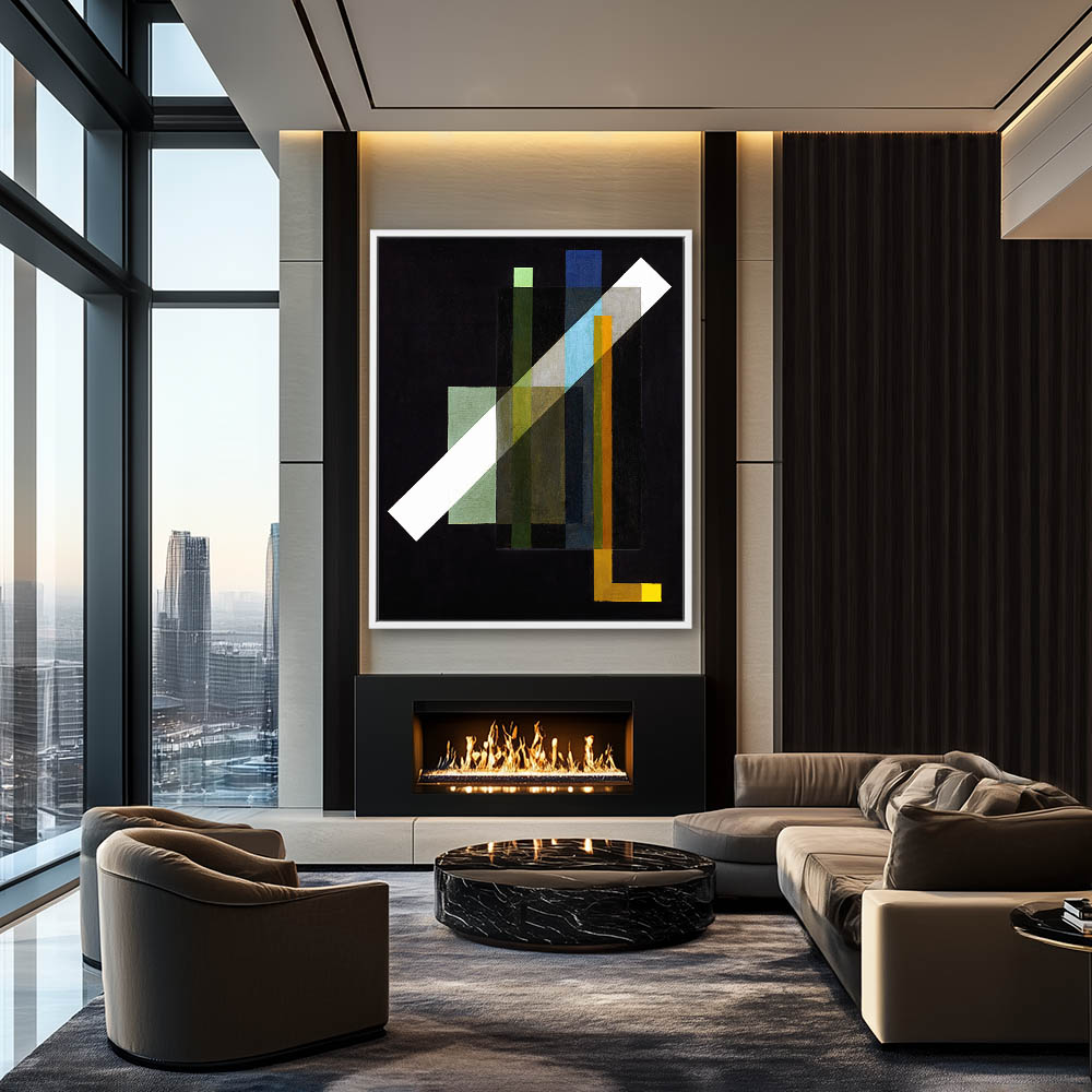 Geometric composition with multicolored rectangles overlapping and intersecting