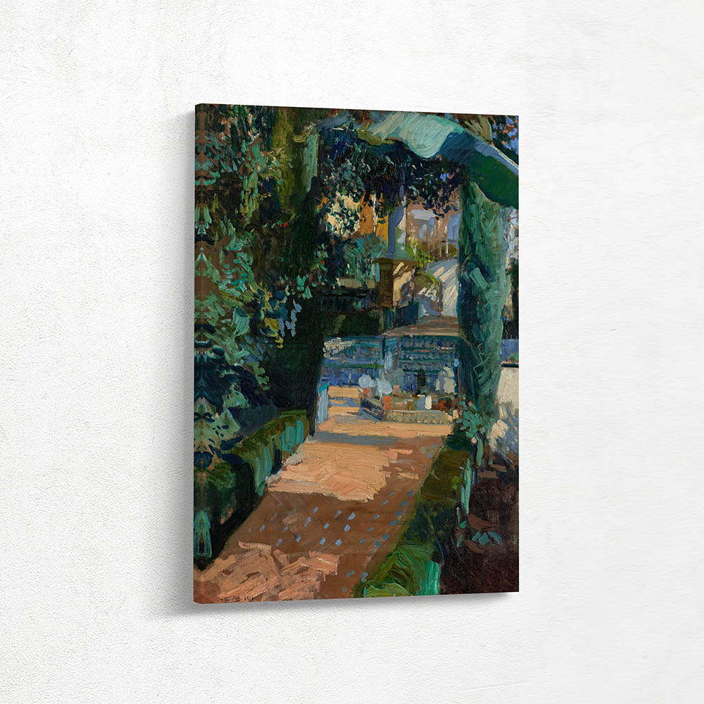 Sunlight and shadow filtered through a courtyard lined with trees, hedges and decorative tiles