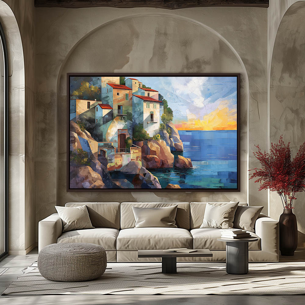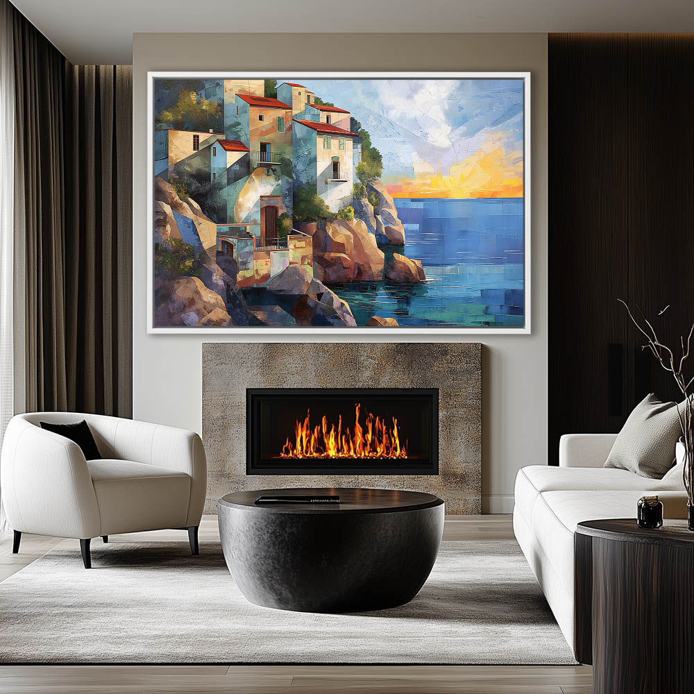 Coastal Painting with a Cottage in the Cliffs and the Sunset over the Sea