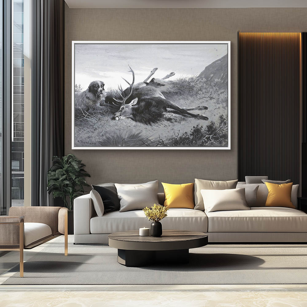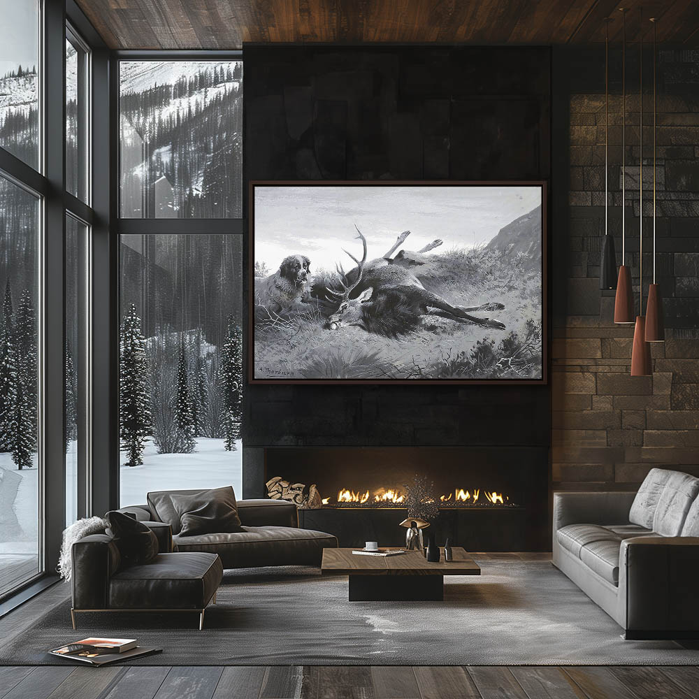 Painting of a Dog with a Hunters Bag a Big Red Stag Buck