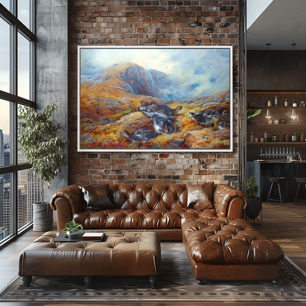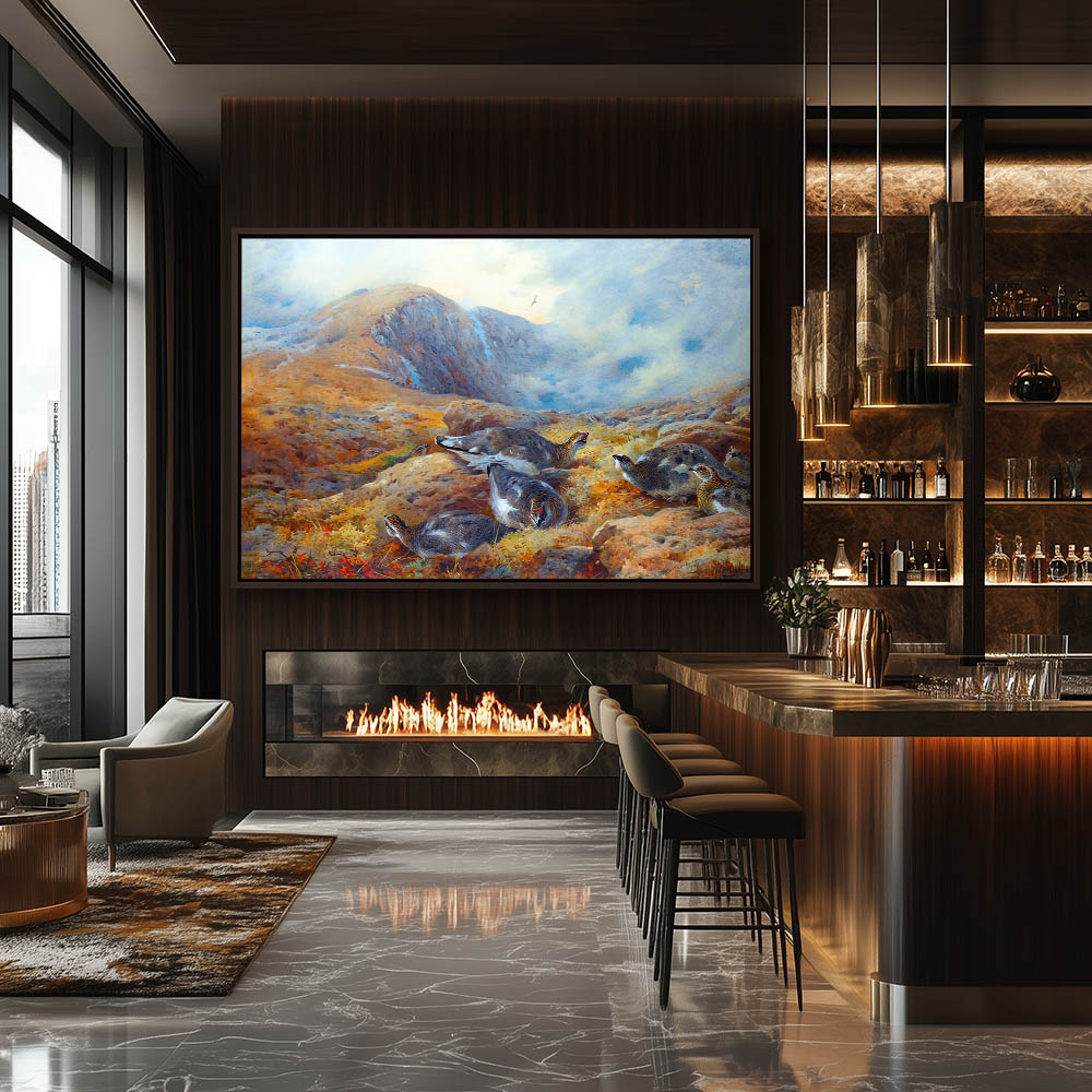 Mountain Landscape Painting with Ptarmigan Some Deer and a Eagle Flyimg Overhead