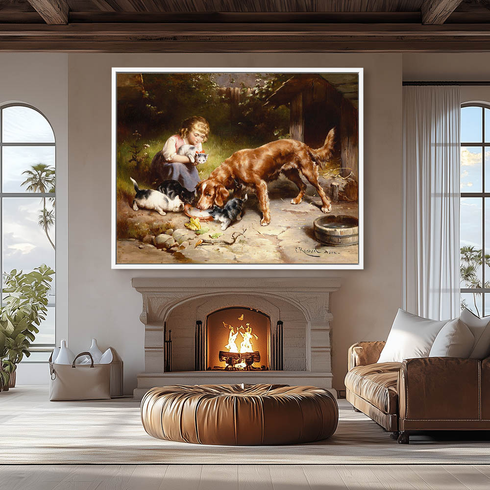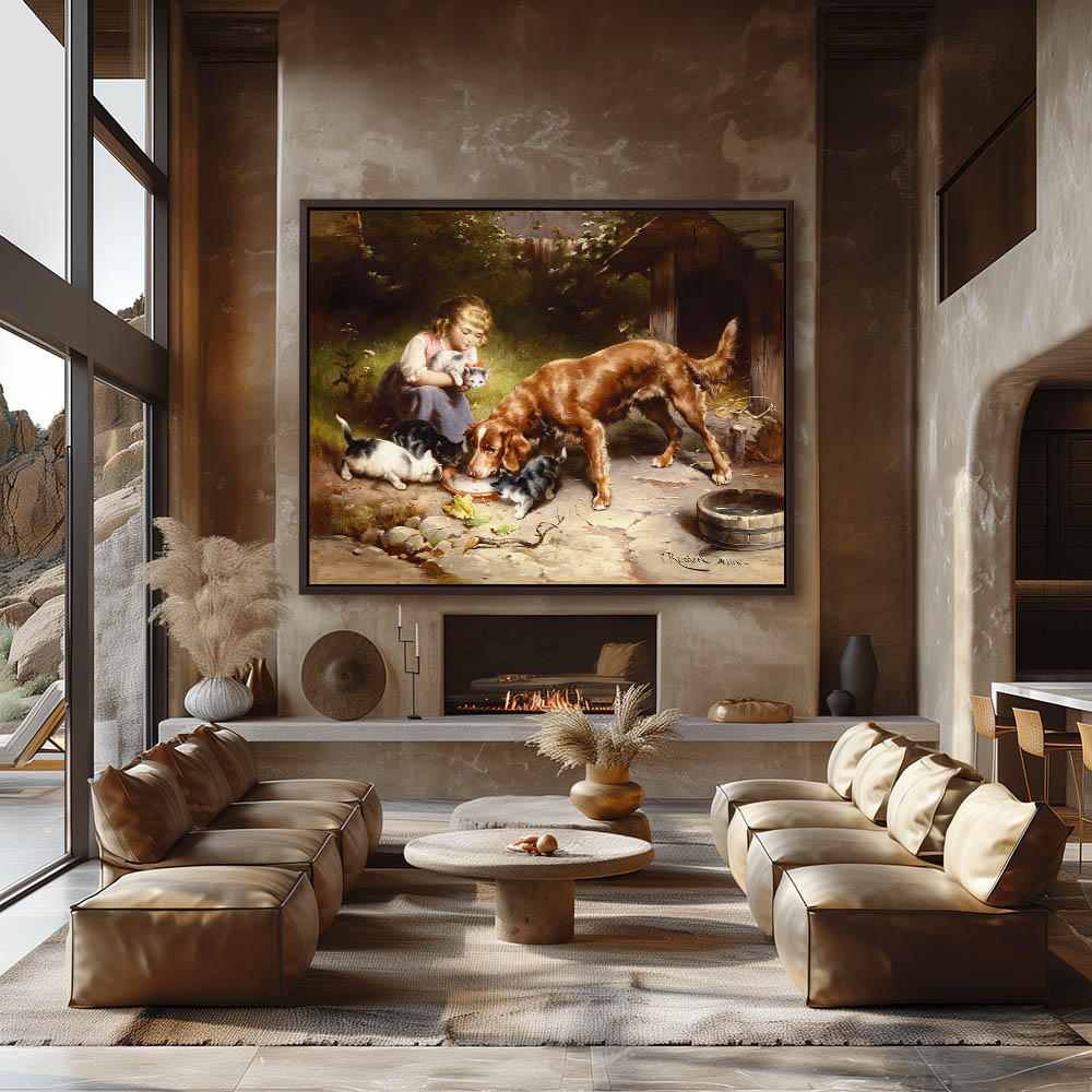 Girl feeding kittens and a dog