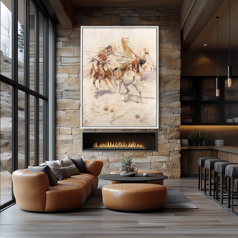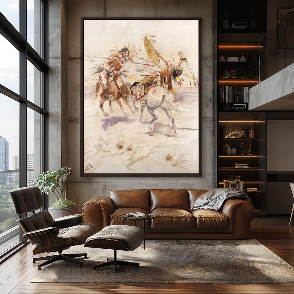 Two Indians on horseback fighting with spears and sheilds. The victor has landed his spear tip in the side of the other while sheilding his face from the tip of a spear.