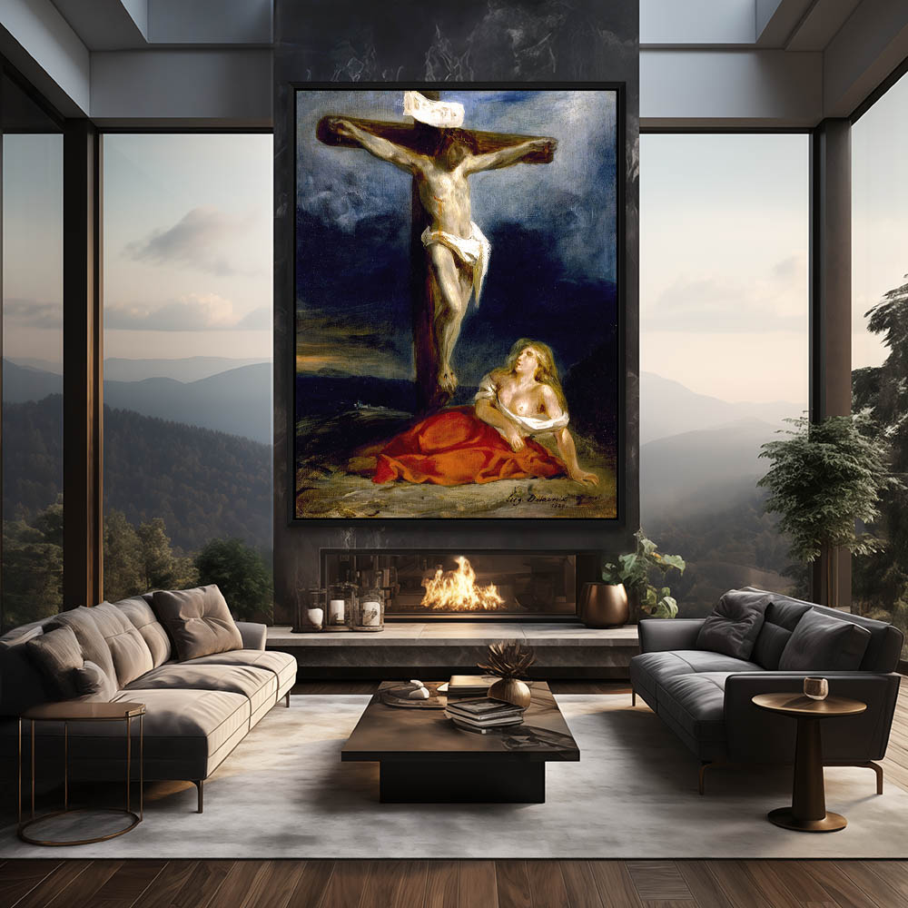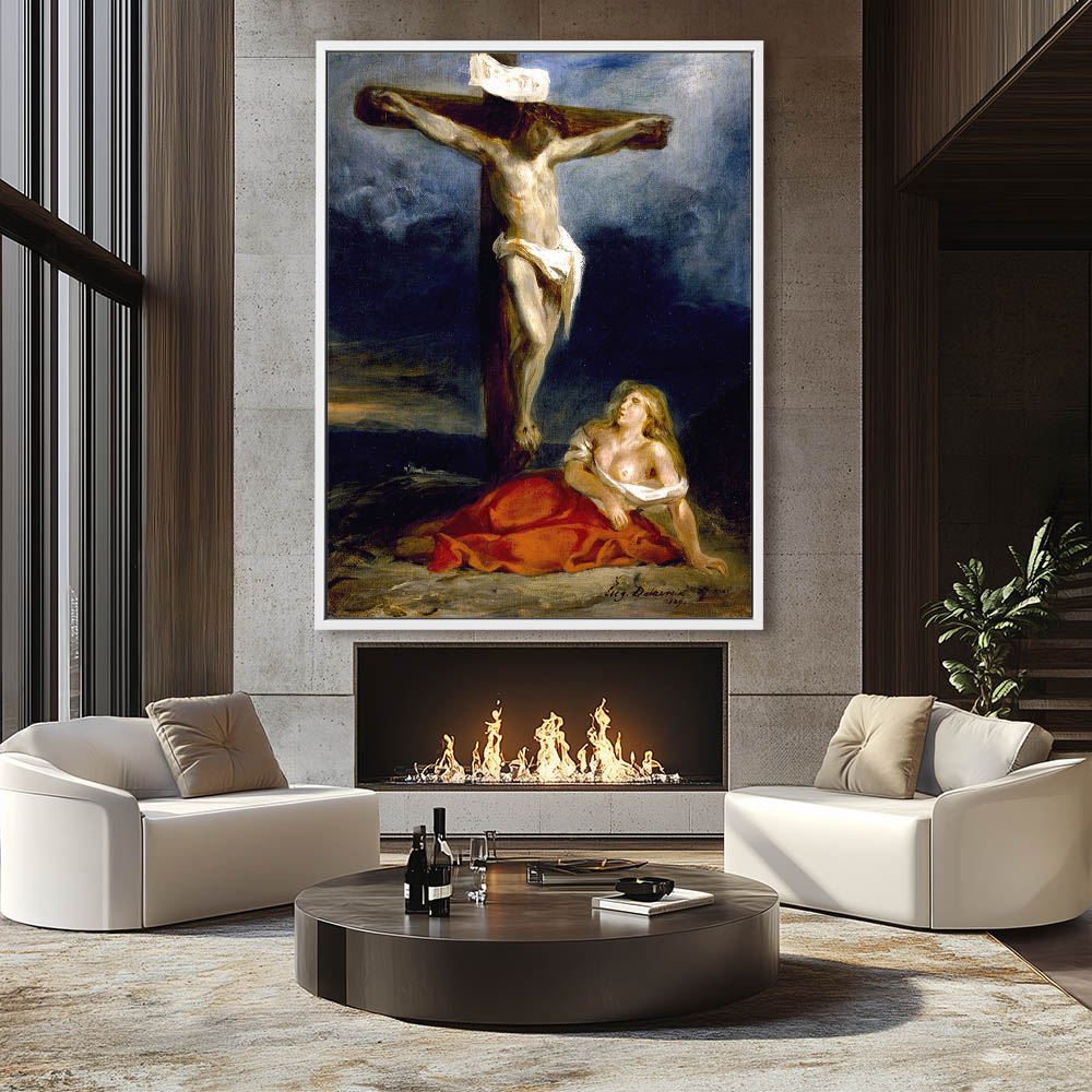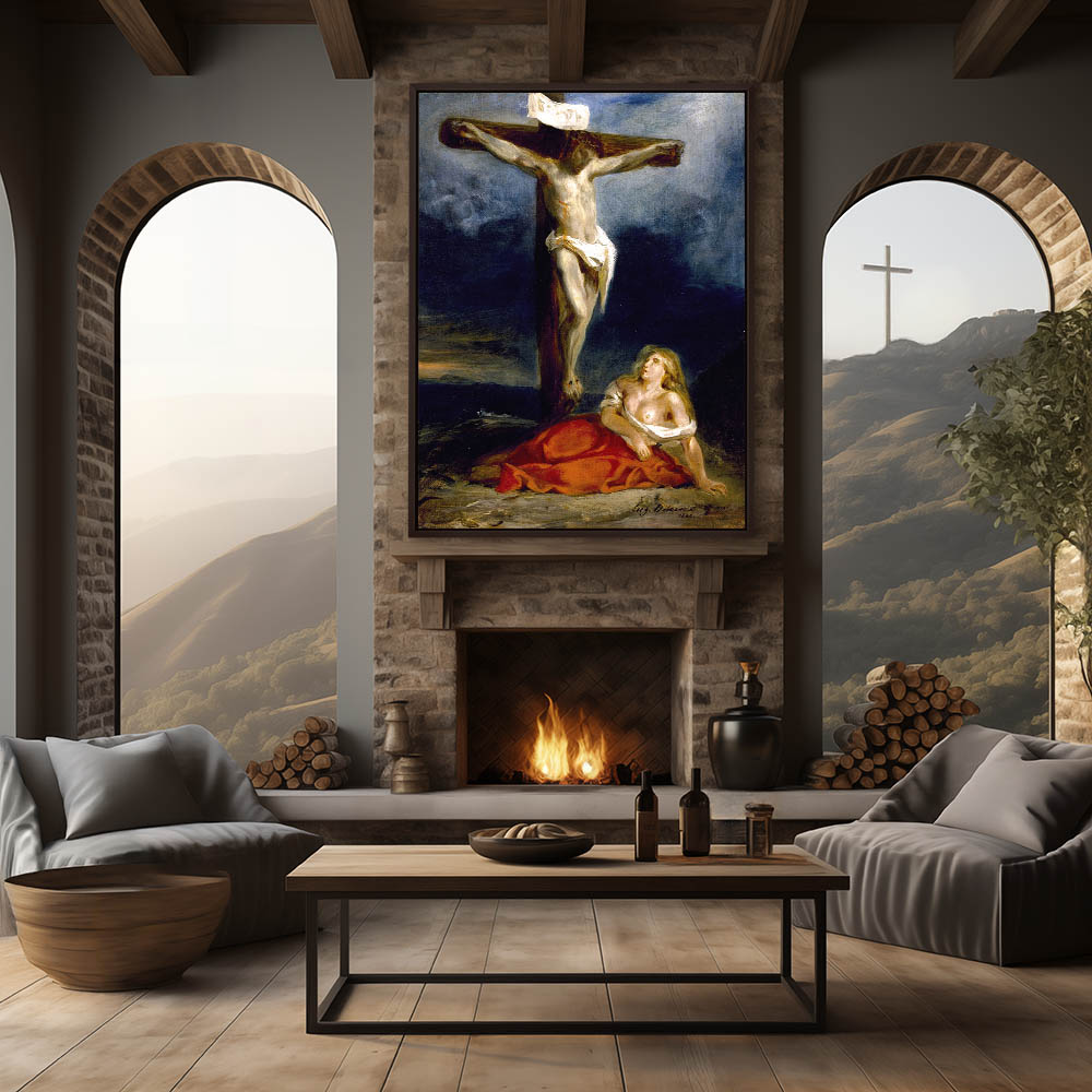 Vintage art prints of Jesus Christ on the cross with Saint Mary Magdalene by Eugene Delacroix depicting a famous biblical scene, perfect for home decor. These paintings come in a variety of sizes and formats to suit any style, including metal wall art, metal prints, vinyl wall prints, peel-and-stick vinyl, vinyl wall peel, fine art prints, framed prints, poster prints, poster art, poster wall art, stretched canvas, and framed canvas wall art with floater frames available in black, brown, or white.