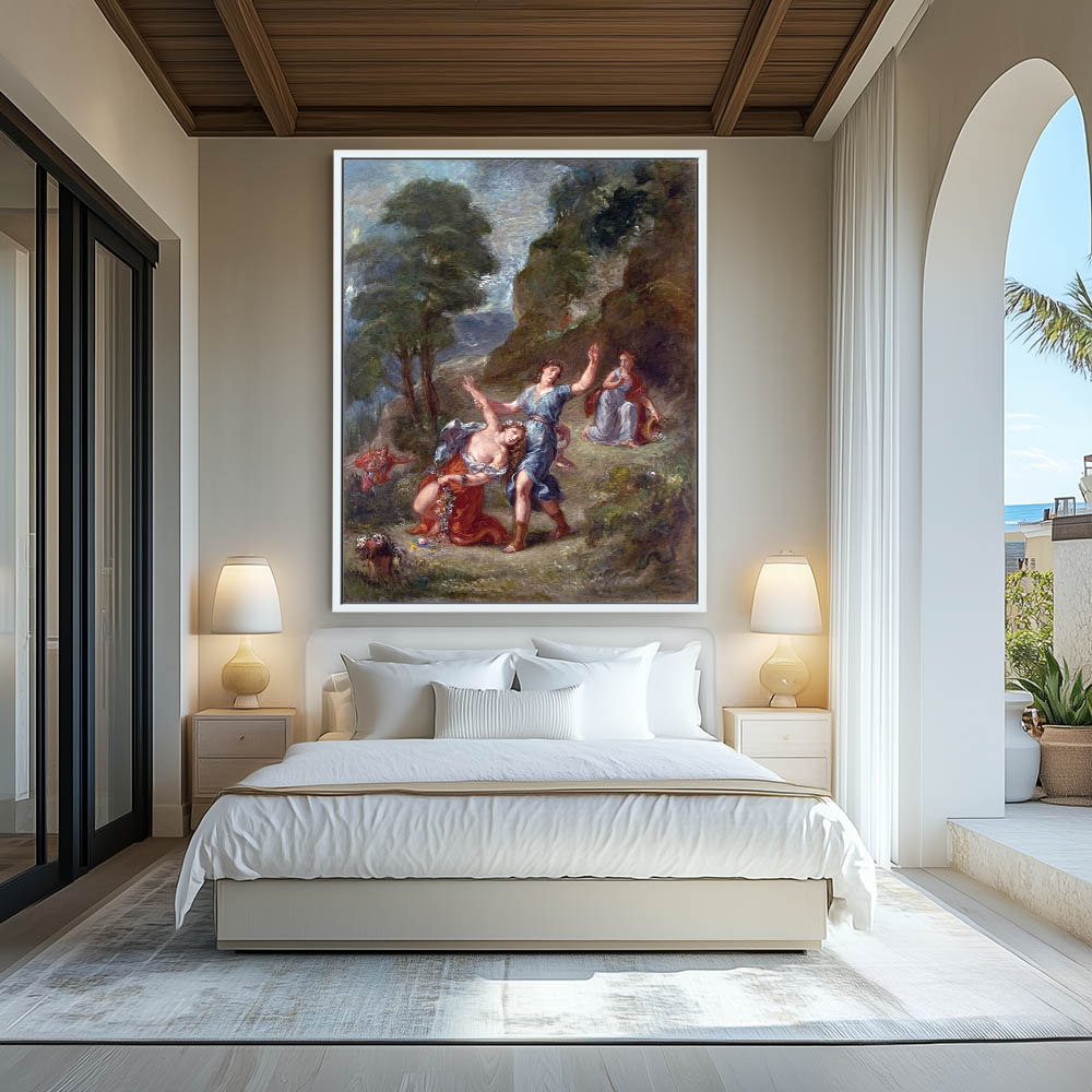 Vintage Figurative Landscape Painting of the Nude Eurydice bitten by a Snake while Picking Flowers