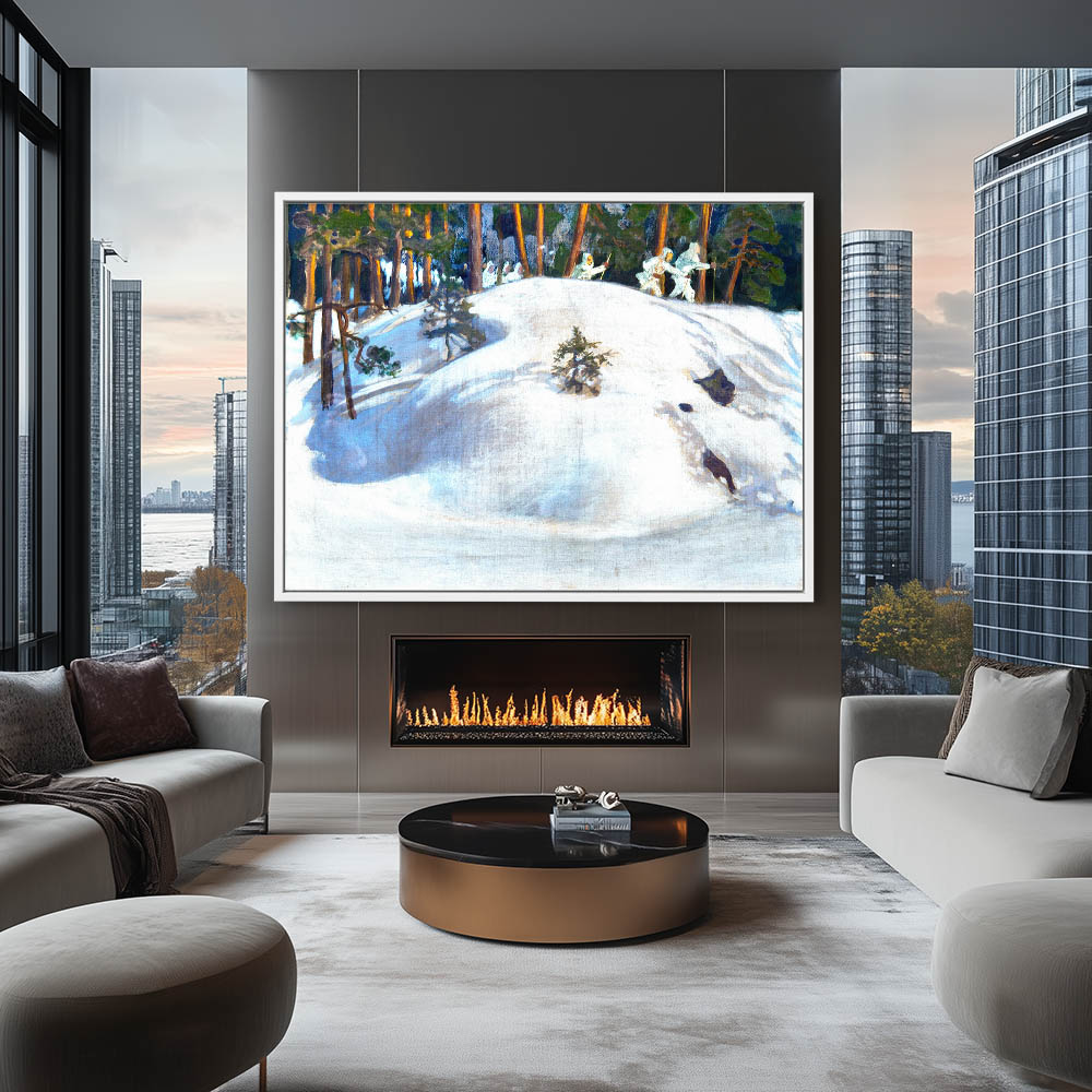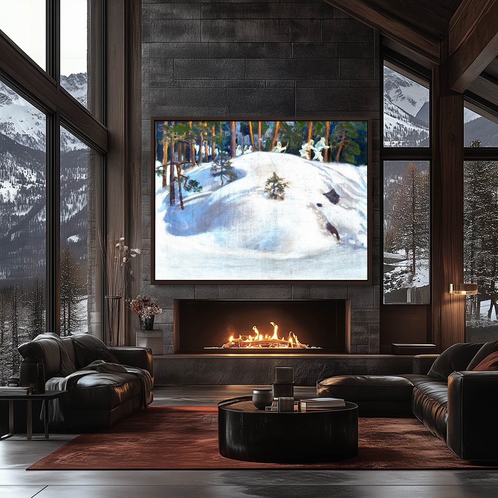 Winter Landscape Painting with Snow and Trees and Snow Skiiers